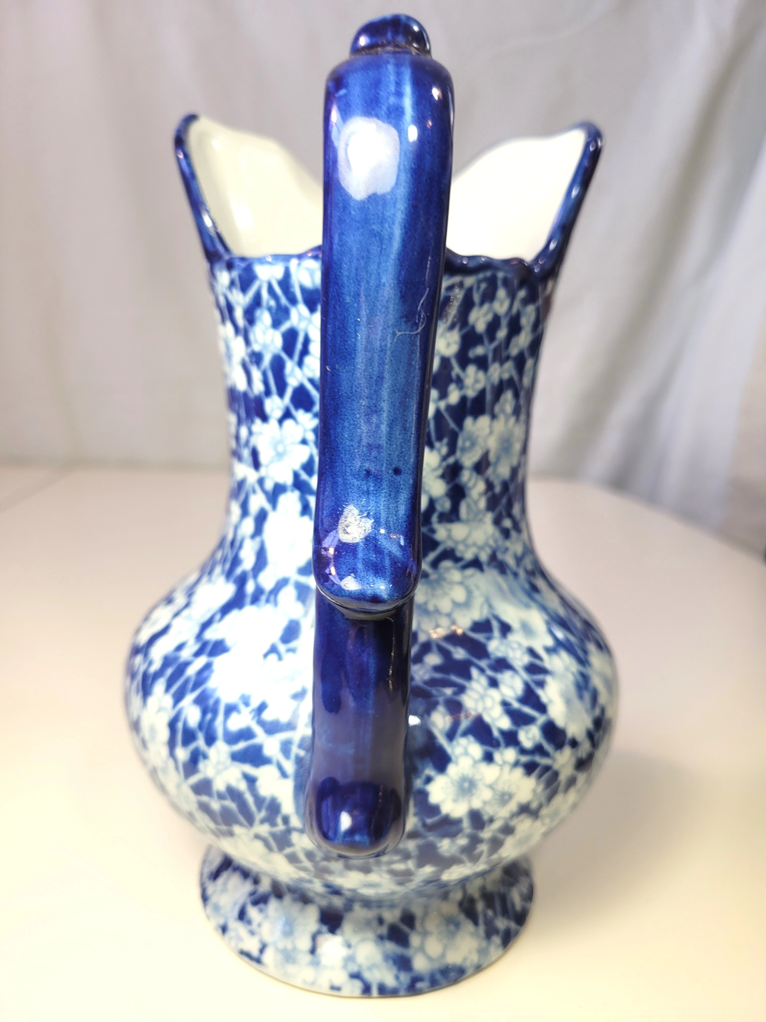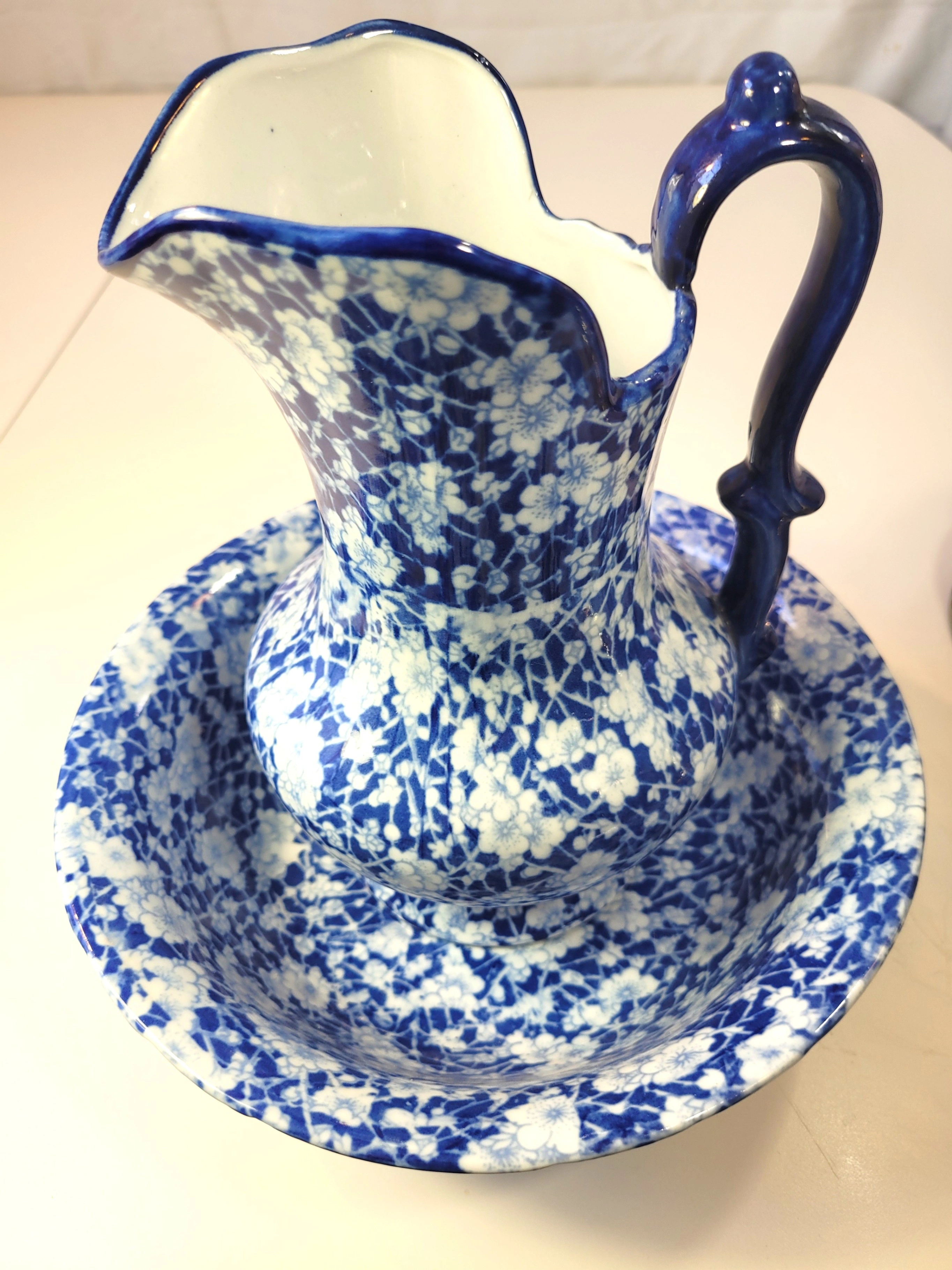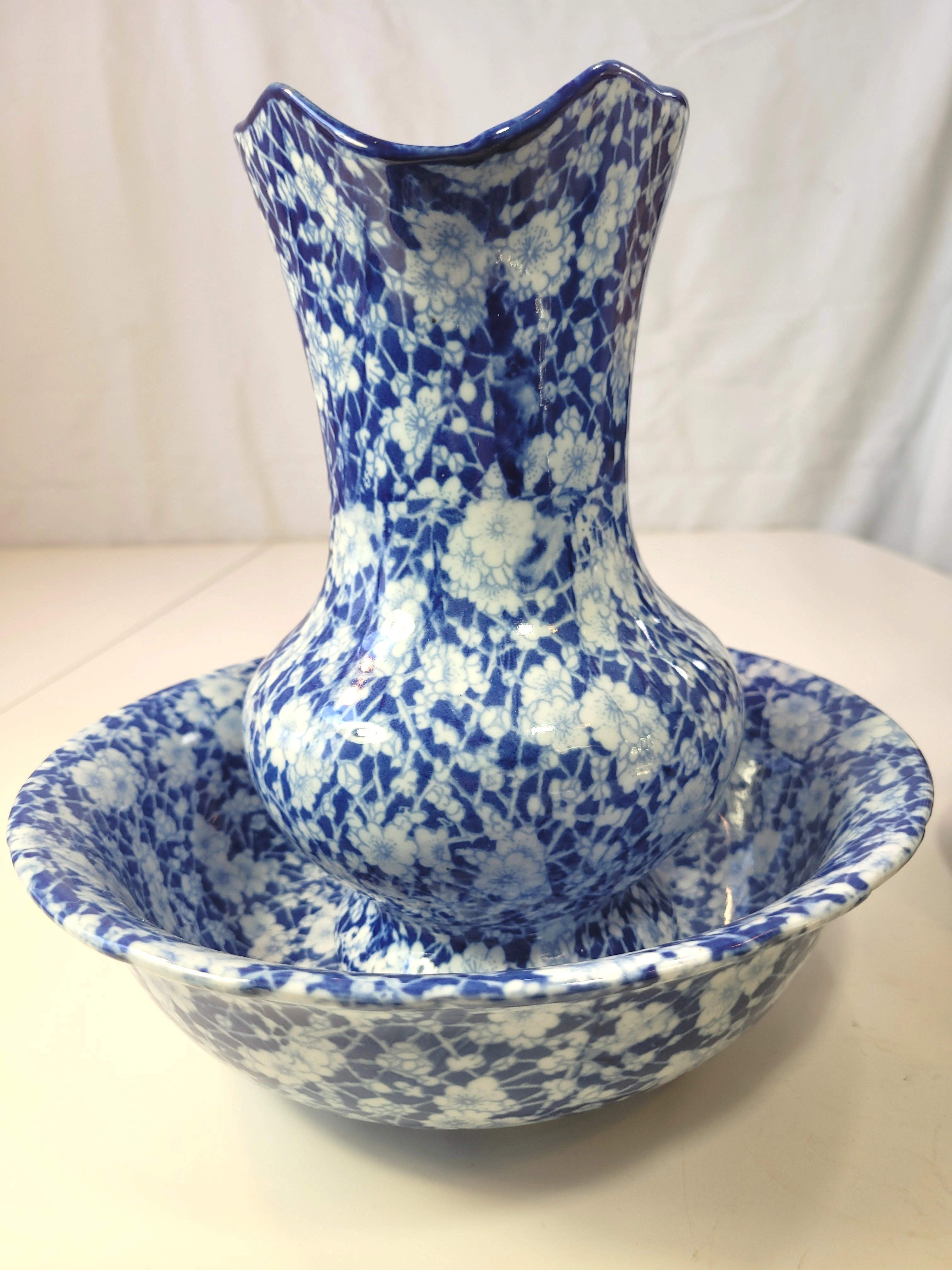 Ironstone Flow Blue Pitcher and Bowl Set Vintage Reproduction