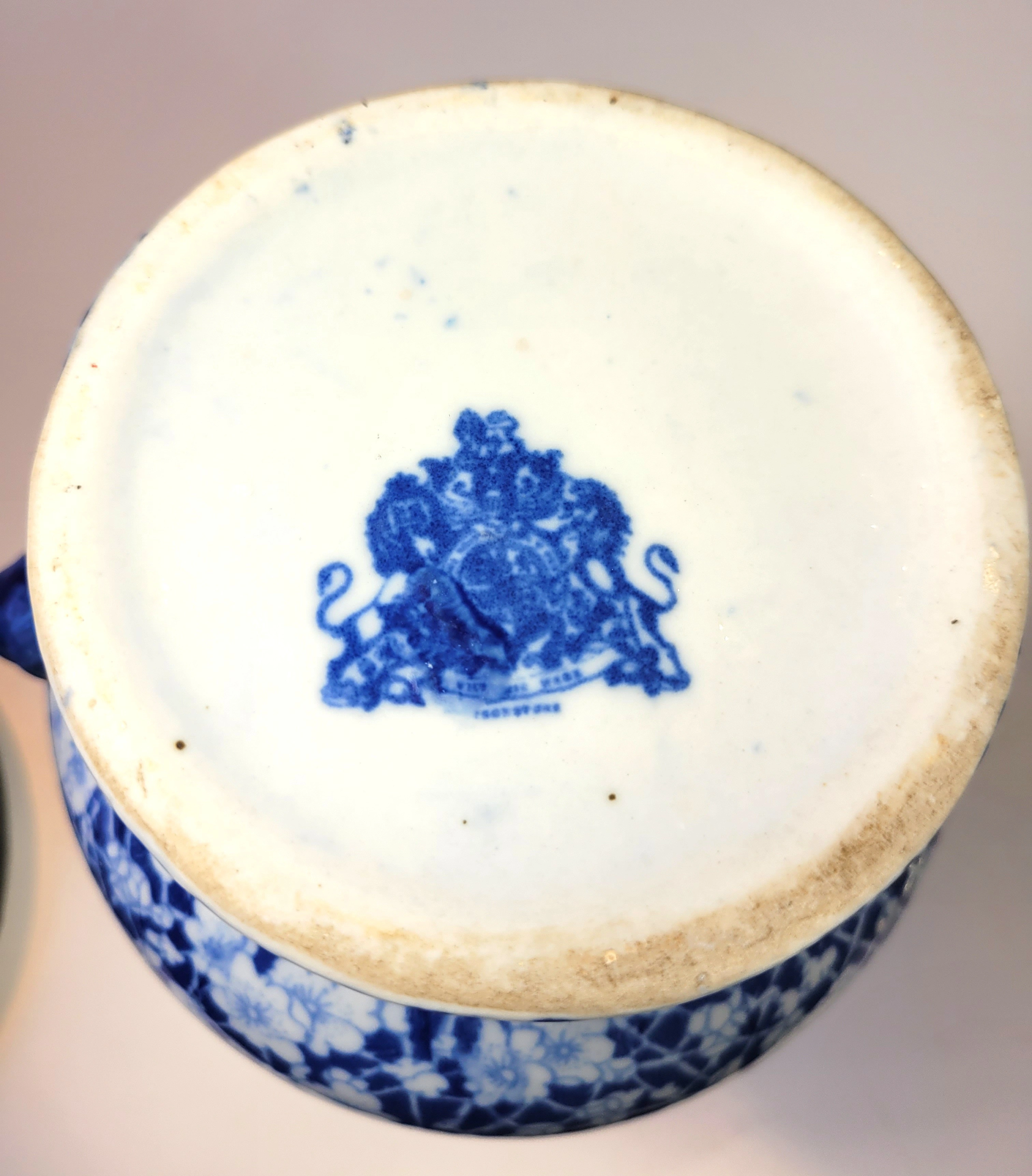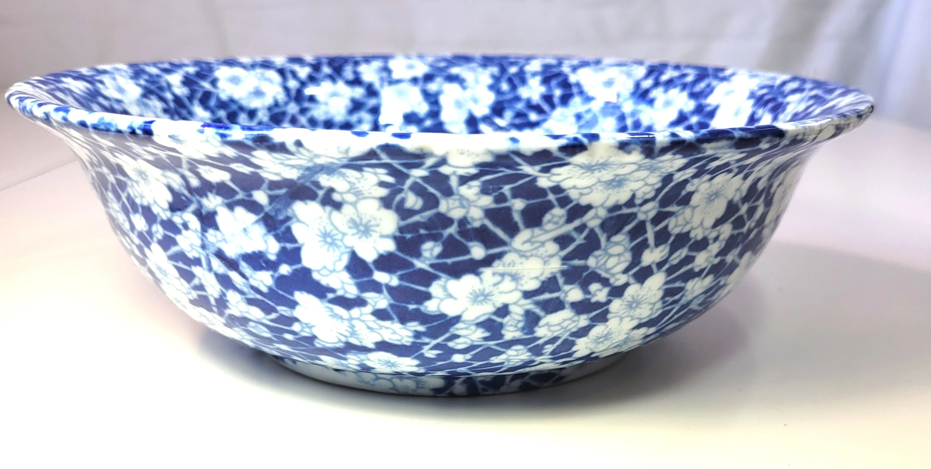 It is made by Victoria Ware Ironstone and features a rich cobalt blue transferware pattern in the classic "Flow Blue" style.