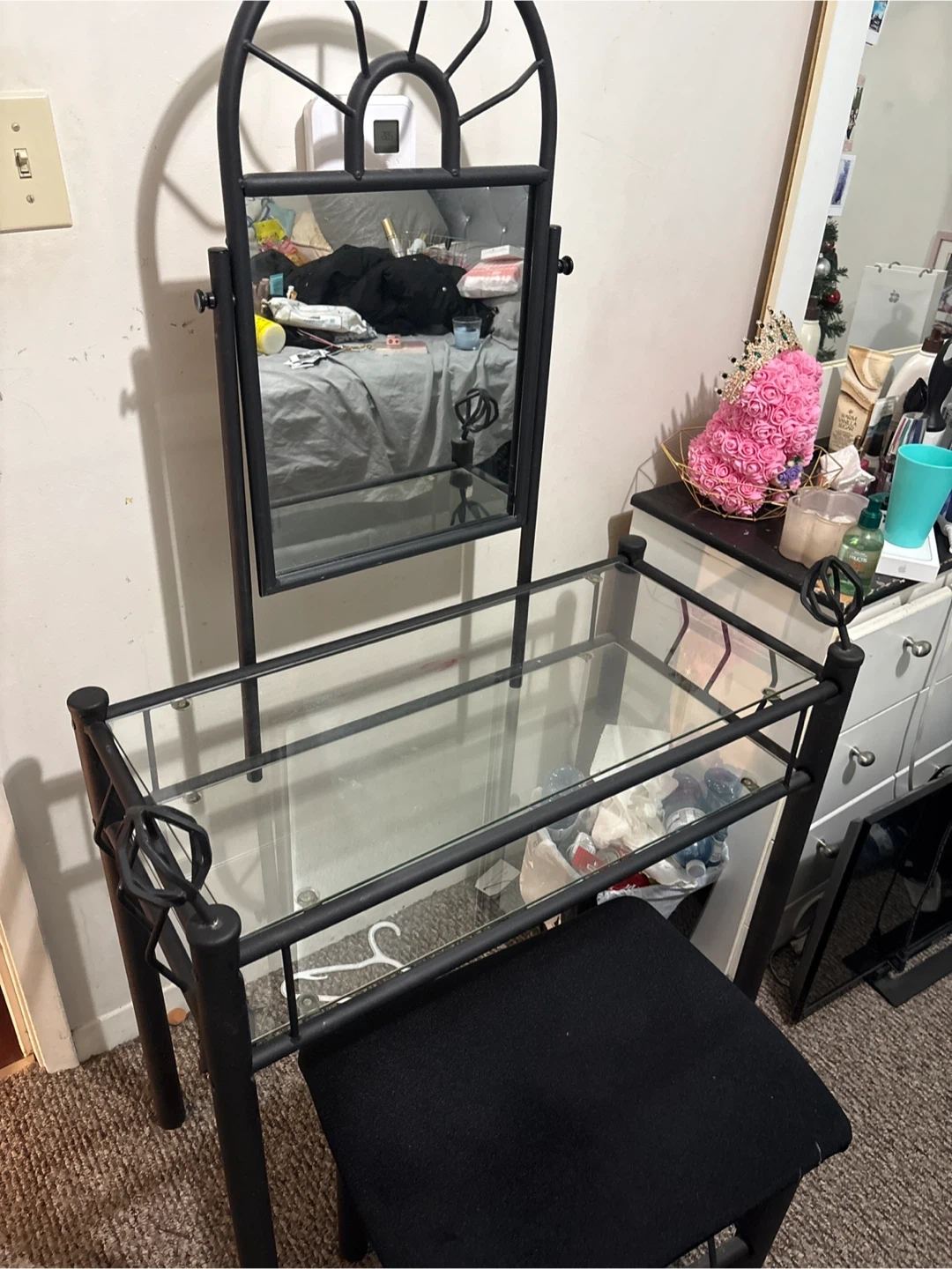 Selling a vanity table in great condition! It features a black metal frame, a glass top, and comes with a matching stool with a black cushion. It's perfect for getting ready in the morning or adding a touch of elegance to your space