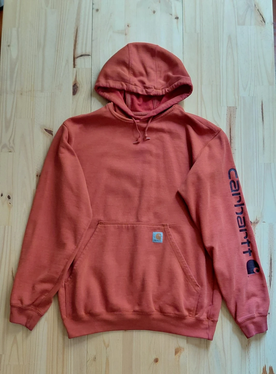 Selling a Carhartt hoodie in a unique reddish-orange colour! It's a size medium and features the Carhartt logo on the sleeve and a small logo patch on the front pocket. It's in great condition and ready for a new owner!