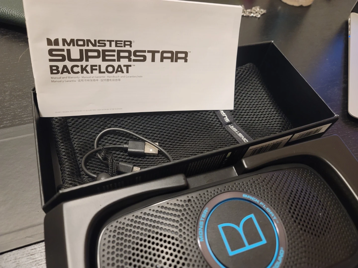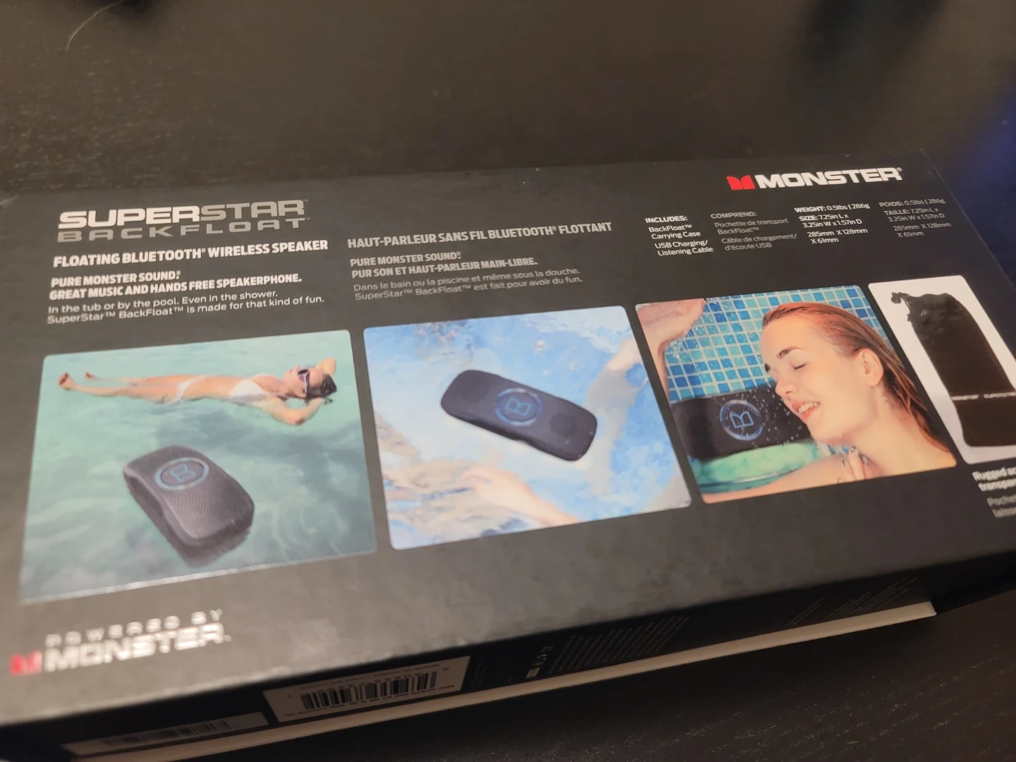 Selling a Monster Superstar Backfloat Bluetooth speaker. It's black and comes with its original box and a USB charging/listening cable. This speaker is a floating Bluetooth wireless speaker and speakerphone, so you can enjoy great music and hands-free calls. It weighs 0.28kg and measures 125mm x 72mm x 60mm