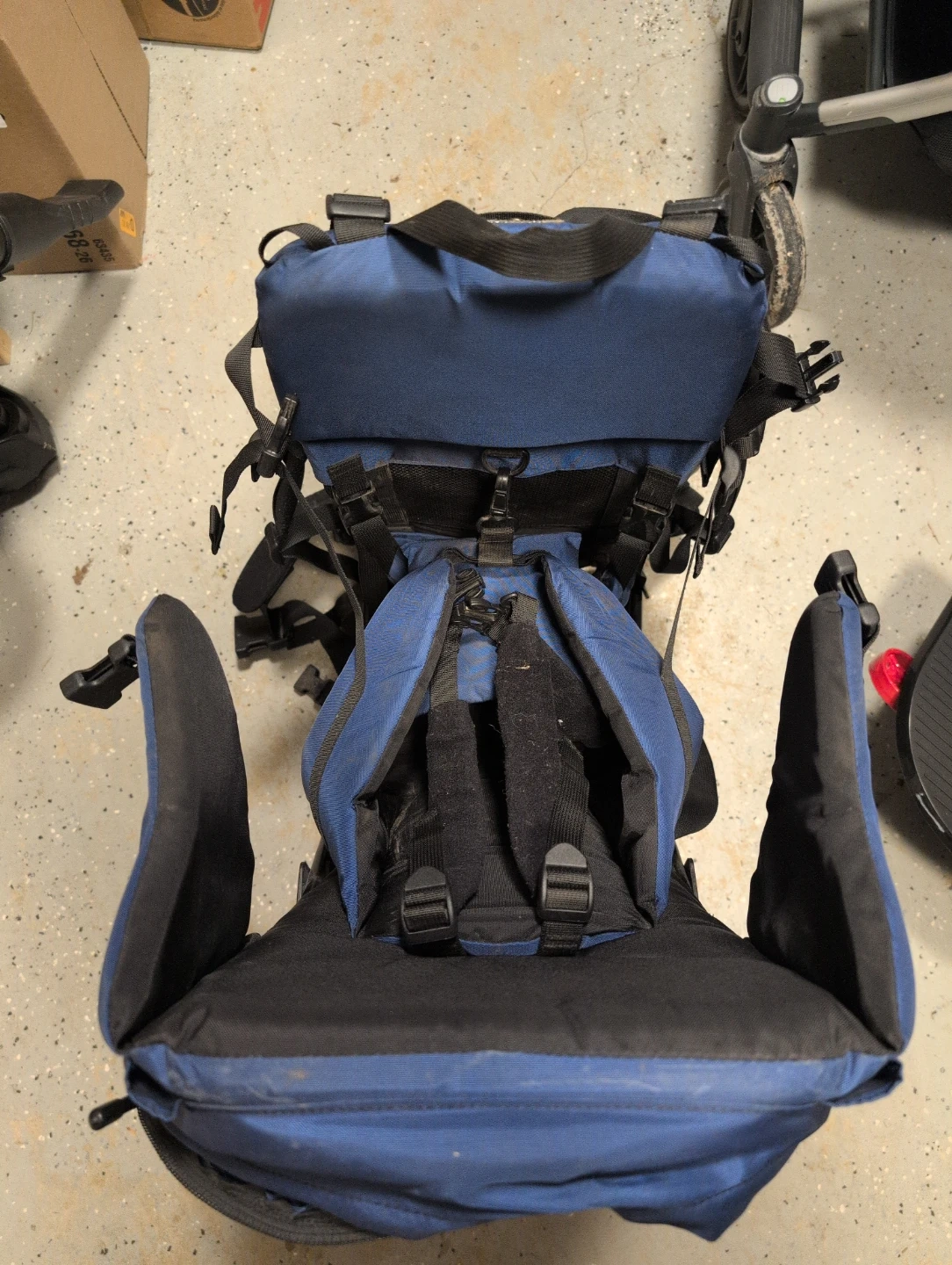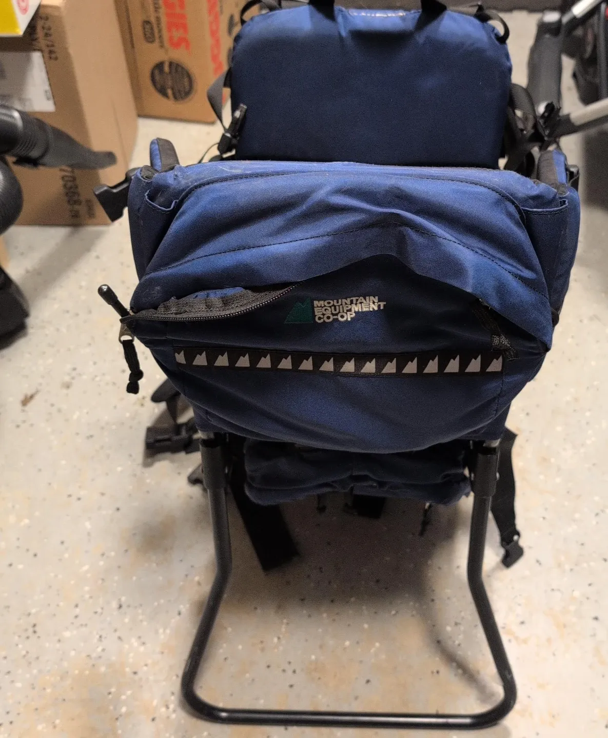 Selling a Mountain Equipment Coop (MEC) child carrier. It's in good shape and ready for your next outdoor adventure with your little one! The carrier is blue and black.