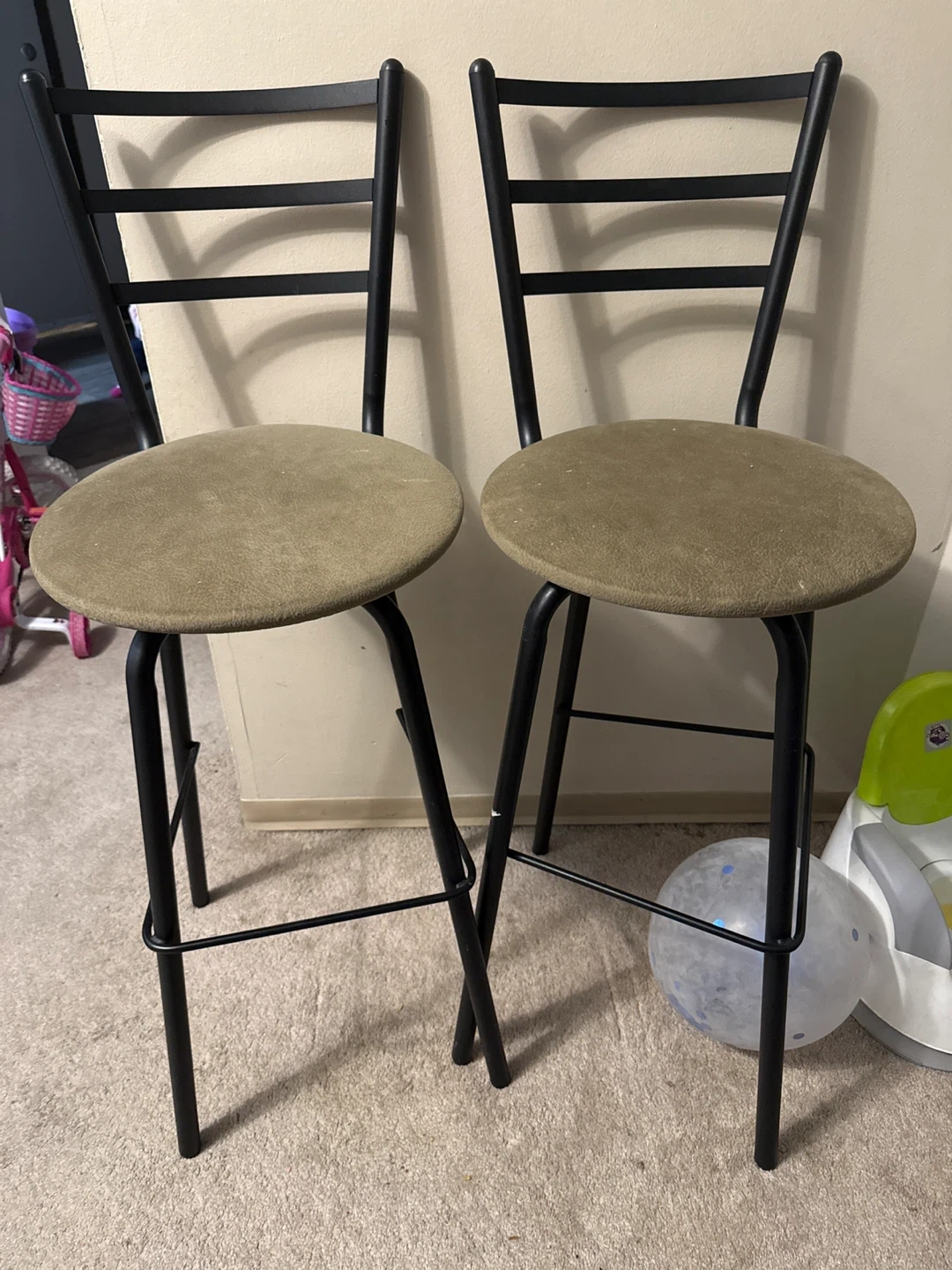 Selling a set of two bar stools. They have a black metal frame and a round, beige seat. They're in good condition and would look great in any kitchen or bar area!