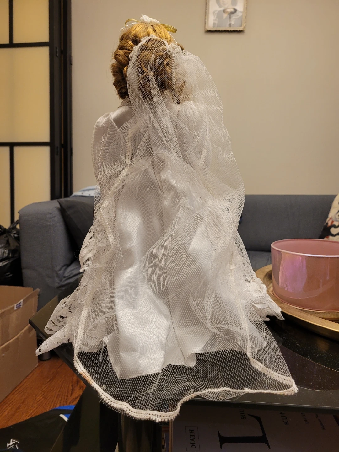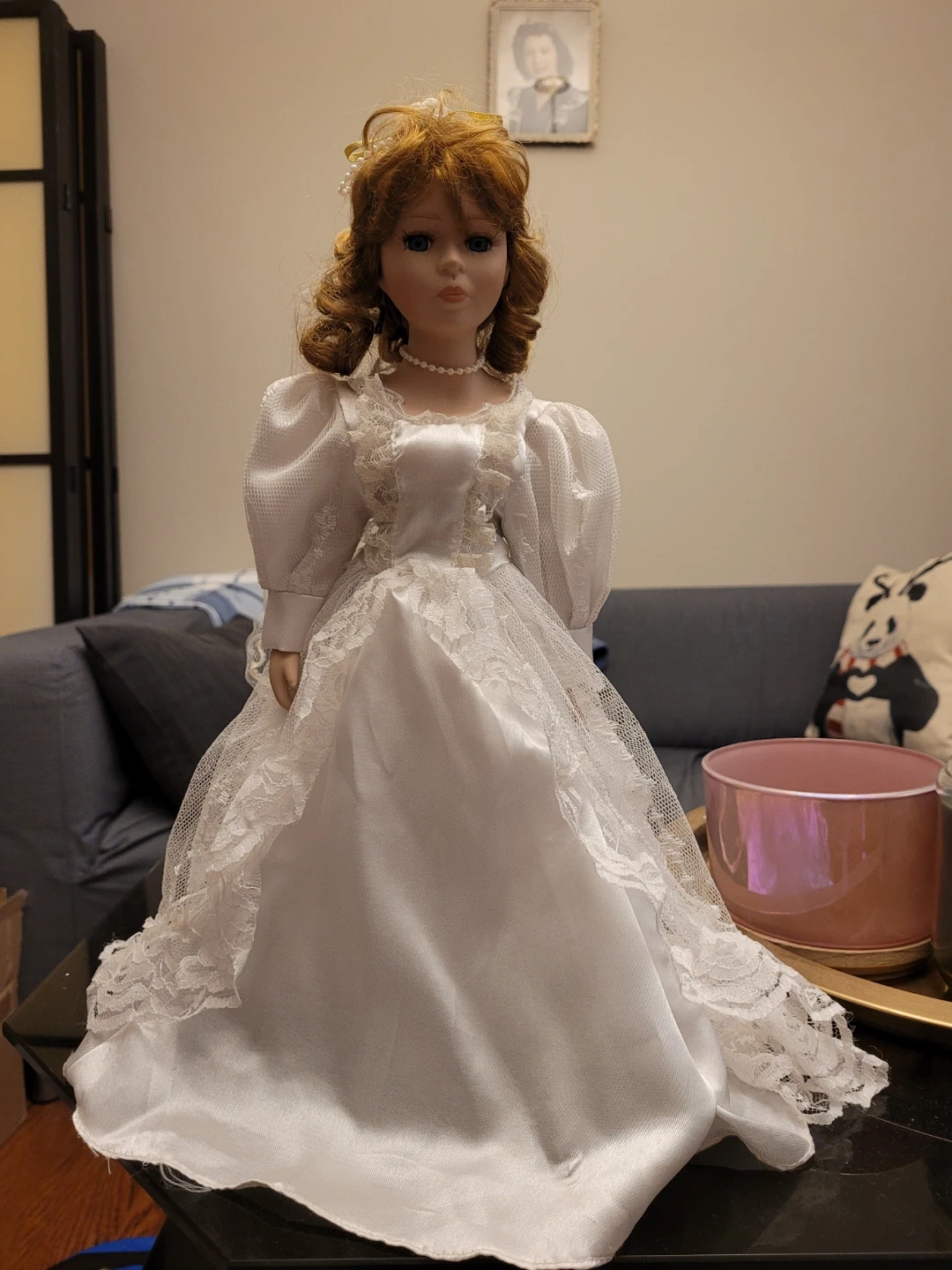 Selling a lovely porcelain bride doll! She's wearing a beautiful white gown with lace details and a long veil. Perfect for collectors or as a decorative piece. A little dusty from being in storage.