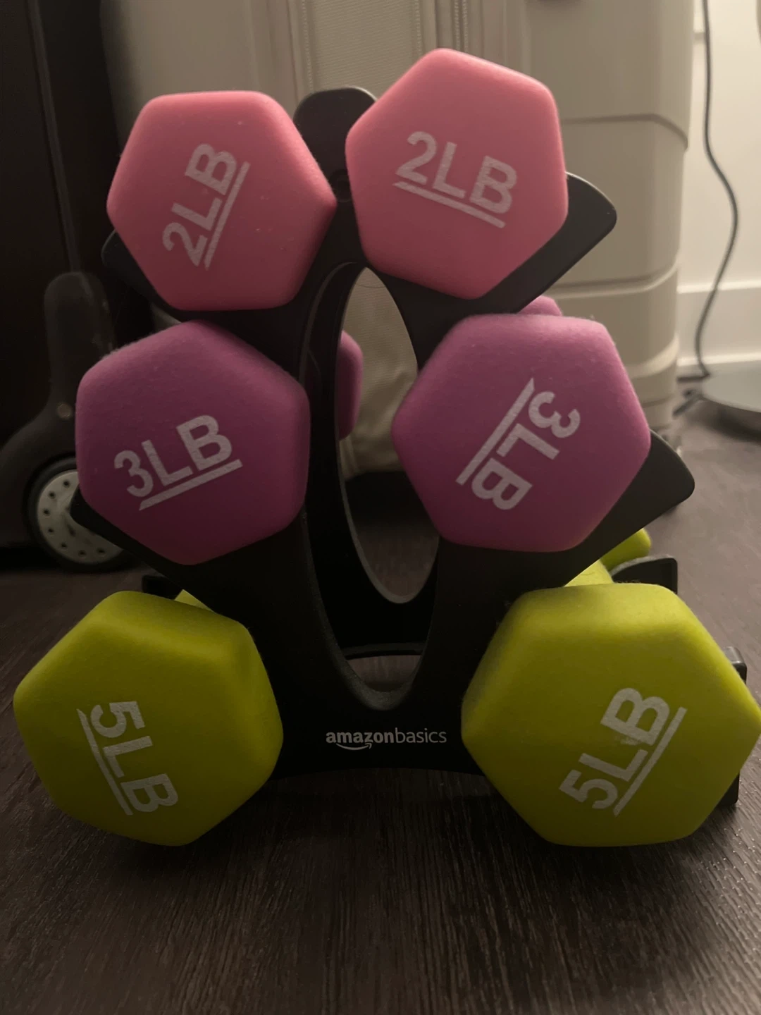 Selling a set of AmazonBasics dumbbells with a rack. The set includes two of 2lb, 3lb, and 5lb dumbbells in pink, purple, and yellow respectively. Great for home workouts!