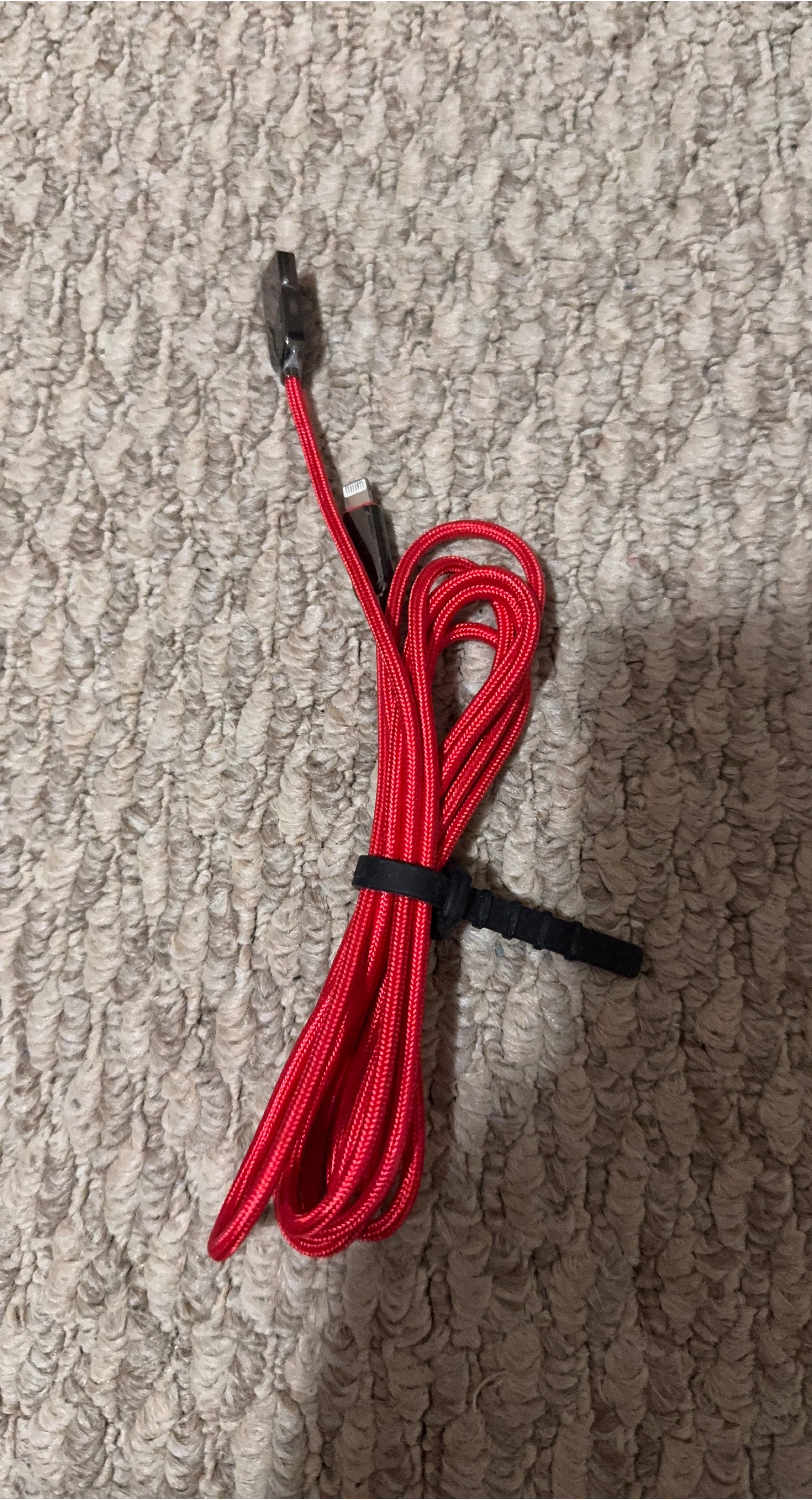 Selling a red braided Lightning cable. It appears to be in good condition and has a black cable tie attached