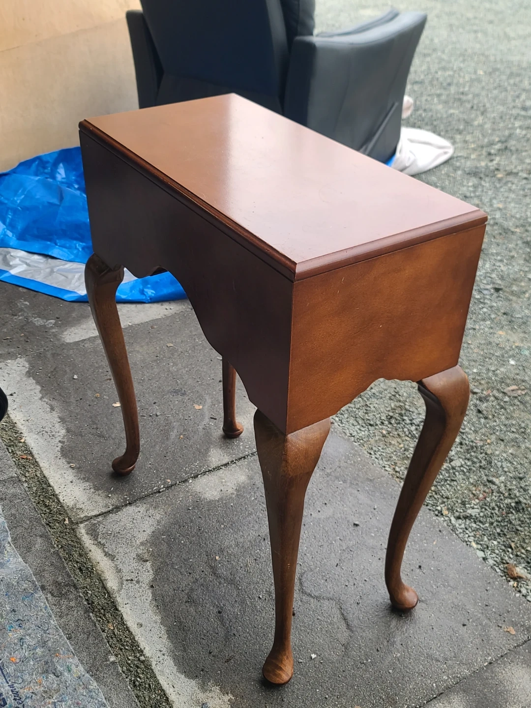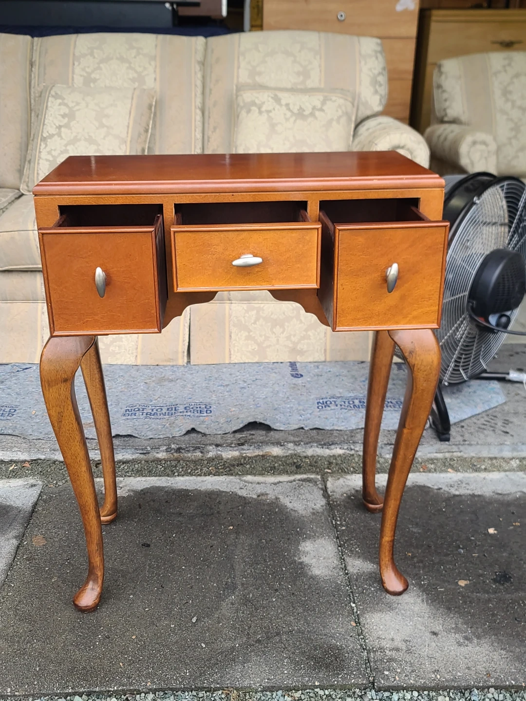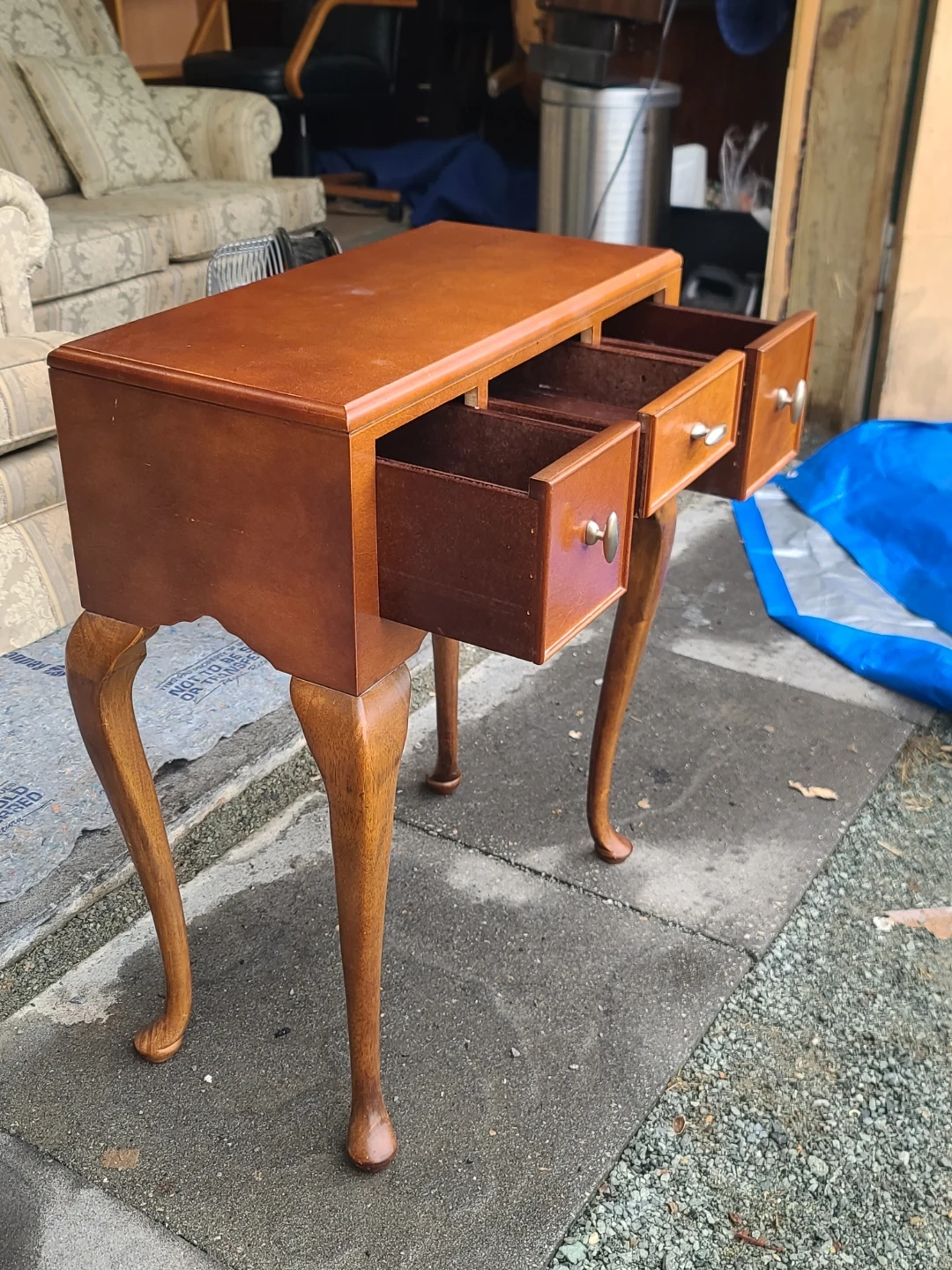 A lovely wooden side table with three drawers! It's a great accent piece for any room. The drawers are perfect for storing small items, and the table itself is sturdy and well-made. It has a classic design with curved legs. Measurements: W 22" × D 11" × H 28 1/2". Delivery can be arranged. Viewing and pickup by appointment.