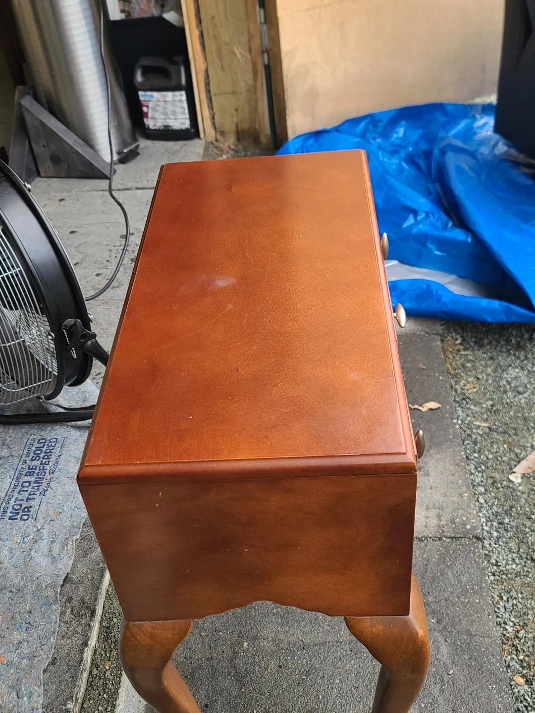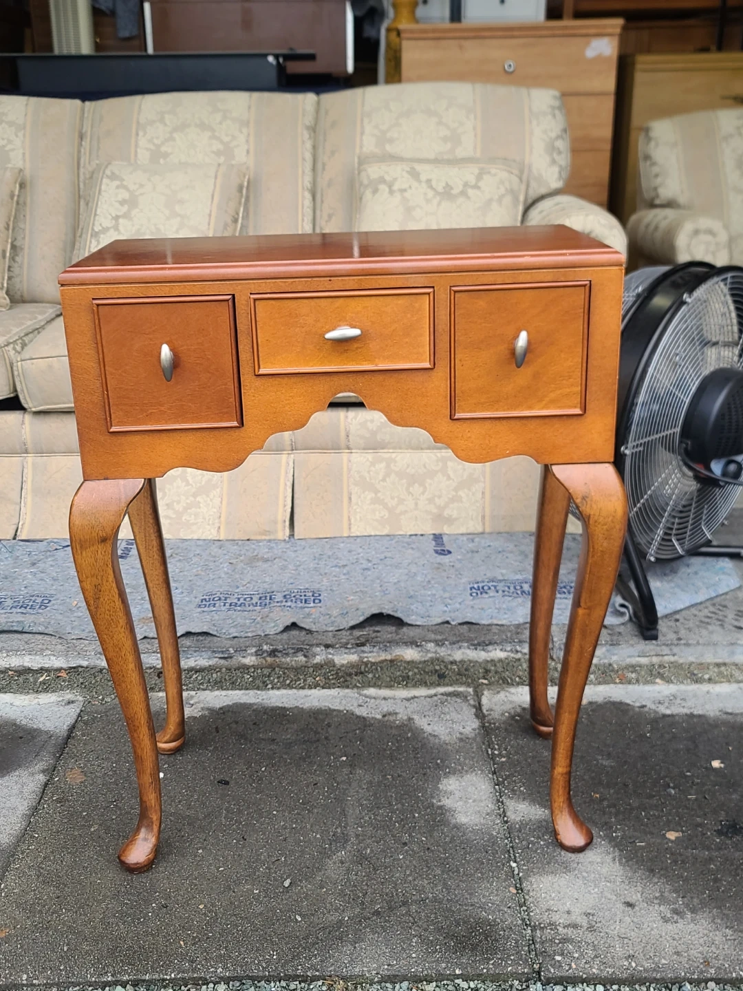 A lovely wooden side table with three drawers! It's a great accent piece for any room. The drawers are perfect for storing small items, and the table itself is sturdy and well-made. It has a classic design with curved legs. Measurements: W 22" × D 11" × H 28 1/2". Delivery can be arranged. Viewing and pickup by appointment.