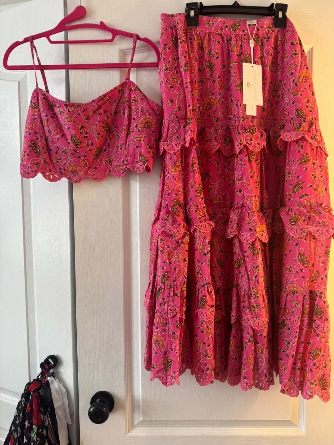 Super cute Caroline Constas two-piece set! The vibrant pink floral pattern is so eye-catching. Perfect for summer days or a night out. In great condition!