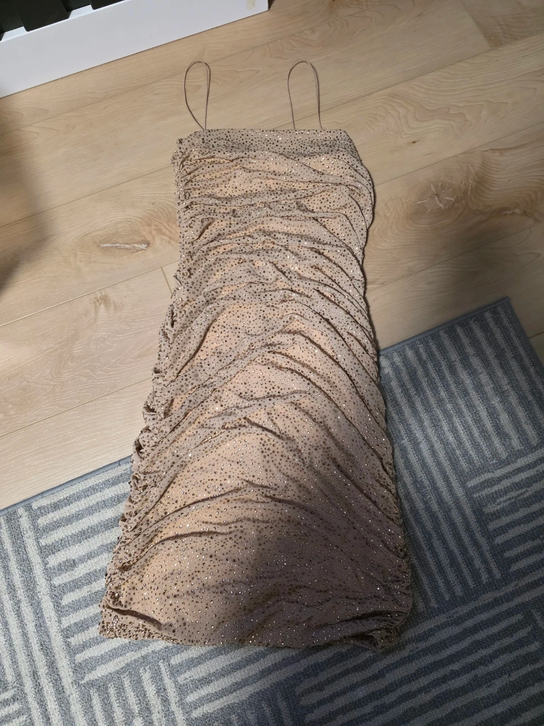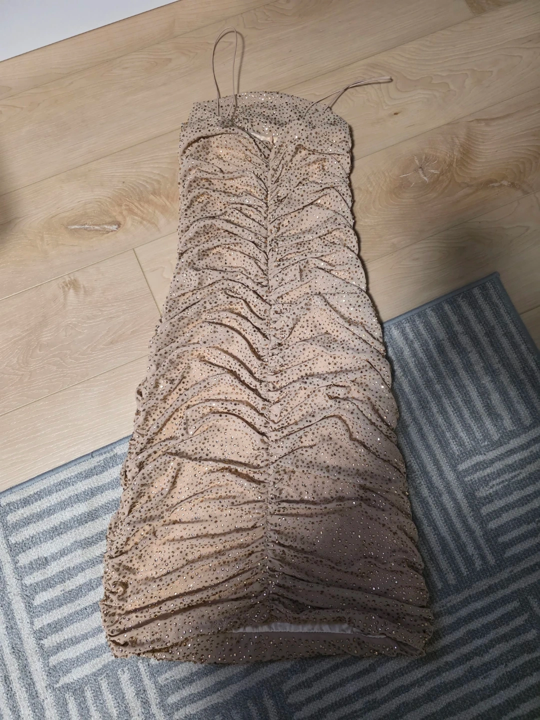 Selling a beige ruched mini dress. It's in great condition and ready for a new owner! The dress has a unique design and would be perfect for a night out or a special occasion