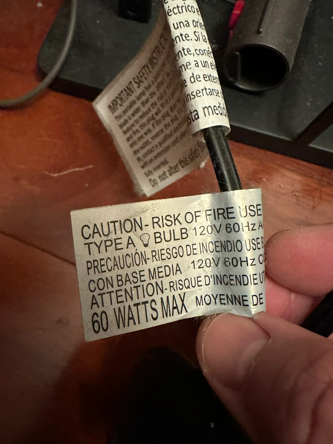Giving away a floor lamp in good condition! It uses a Type A bulb, 120V 60Hz, and a maximum of 60 watts. Perfect for adding some light to any room!