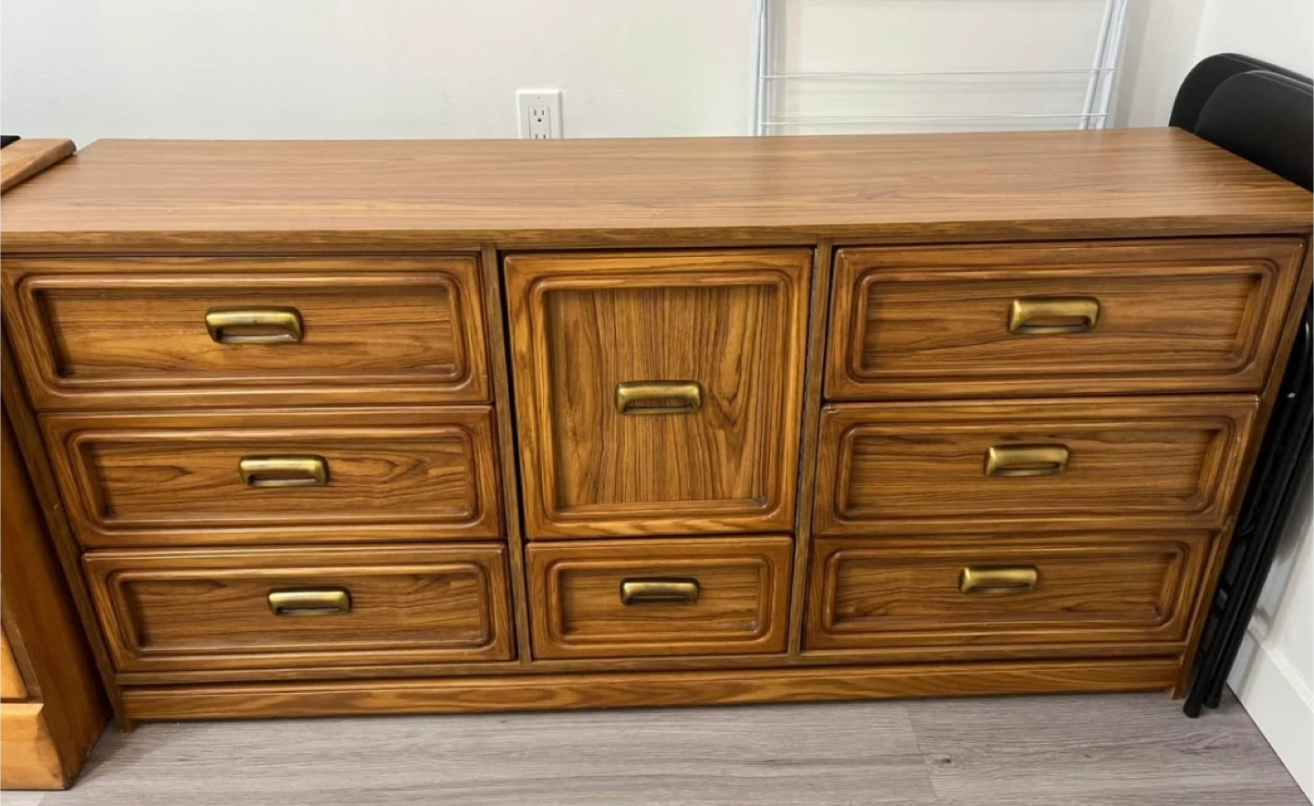 Here's a lovely wood dresser with nine drawers! It's in good condition and would be a great addition to any bedroom or living space. The dresser has a unique design with a central cabinet and golden handles. Some wear and tear. Pick up only