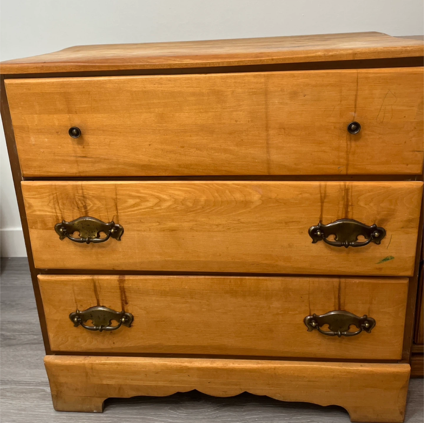 Selling a wooden dresser with three drawers. It's a great piece for adding storage to any room. There are some signs of wear and use on the top surface, as shown in the pictures, but overall it's still a functional and sturdy piece of furniture. Pick up only