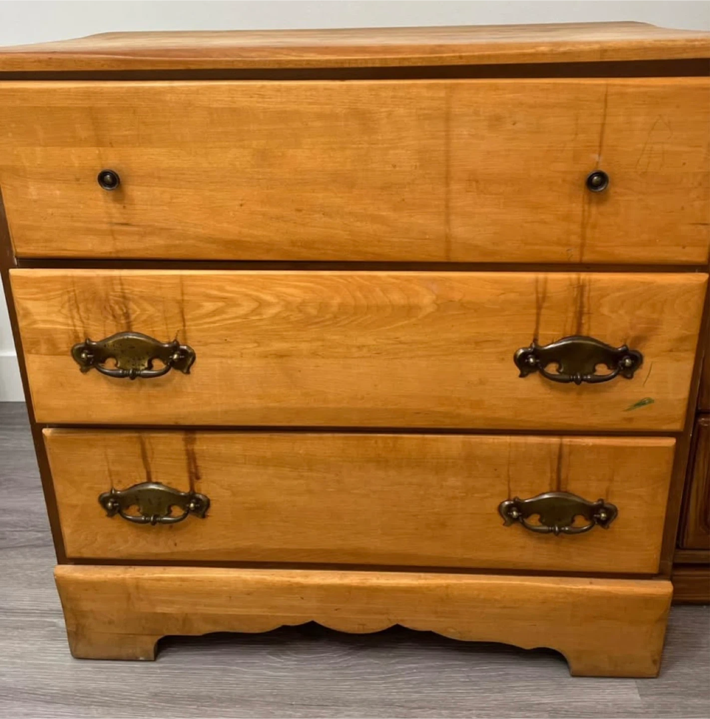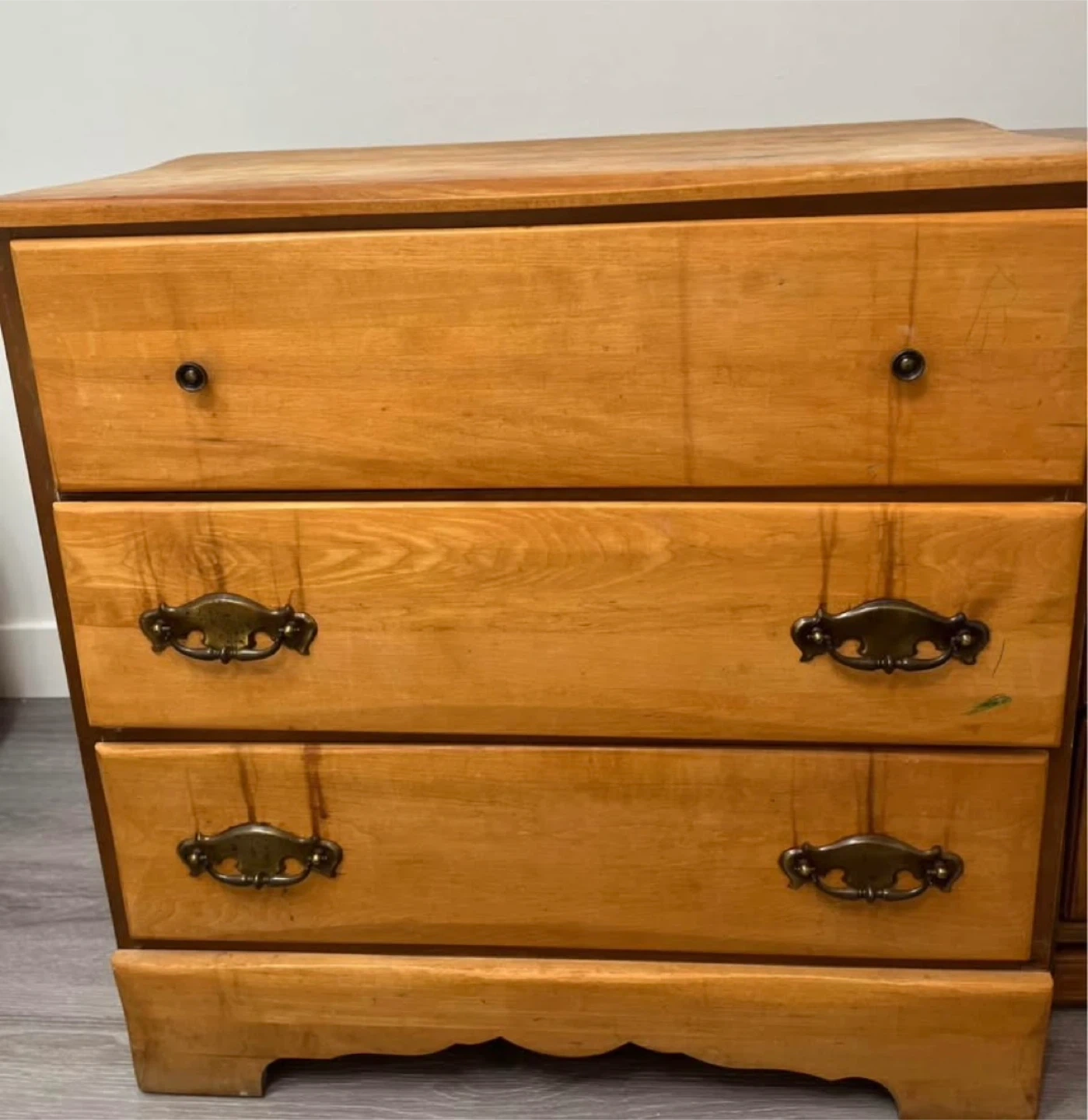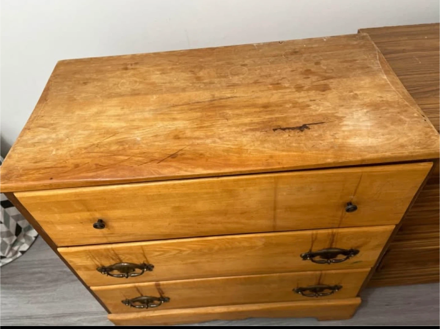 Selling a wooden dresser with three drawers. It's a great piece for adding storage to any room. There are some signs of wear and use on the top surface, as shown in the pictures, but overall it's still a functional and sturdy piece of furniture. Pick up only