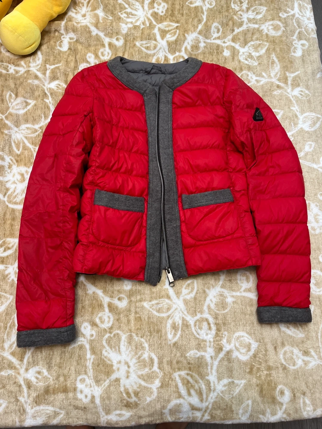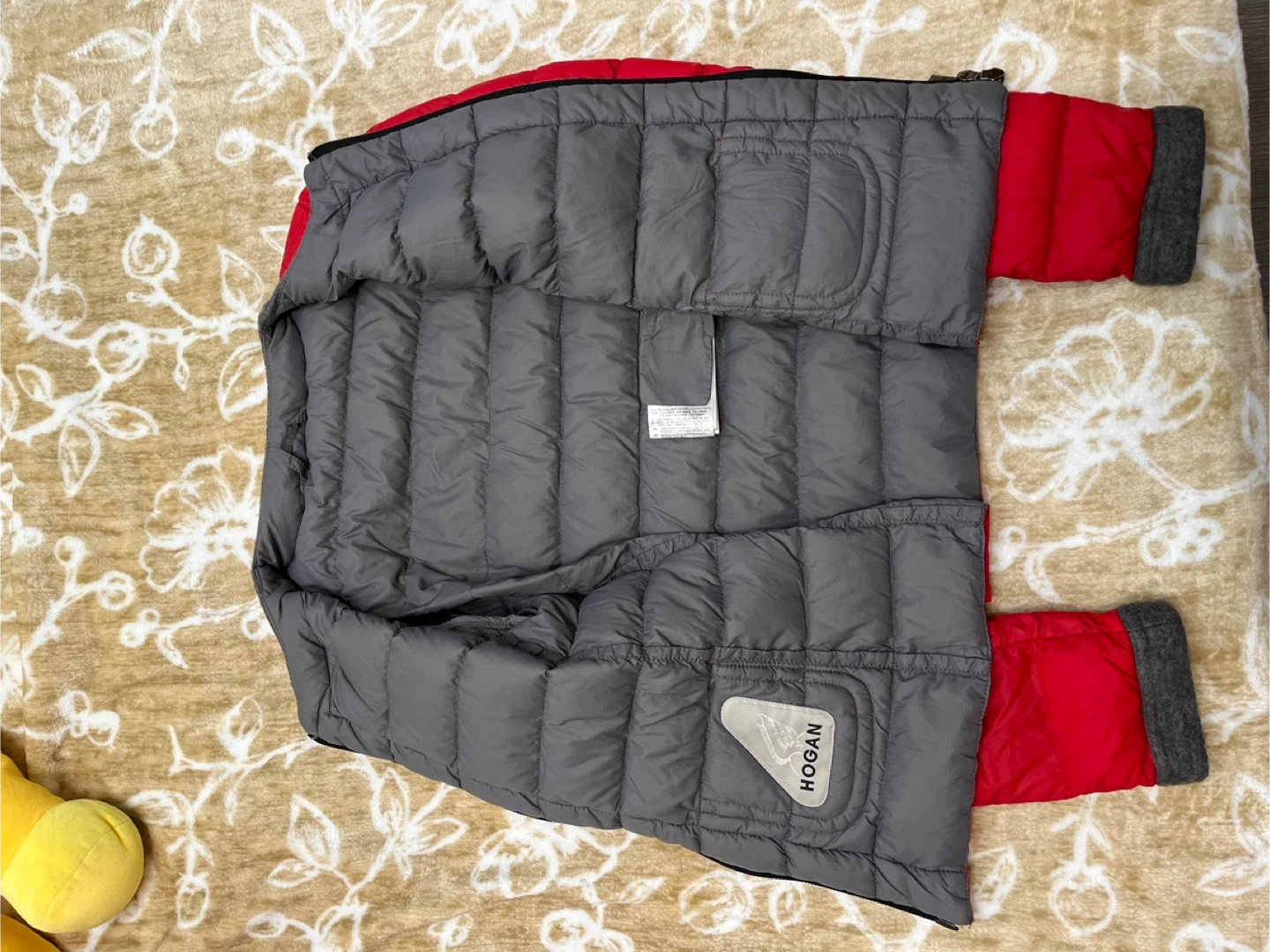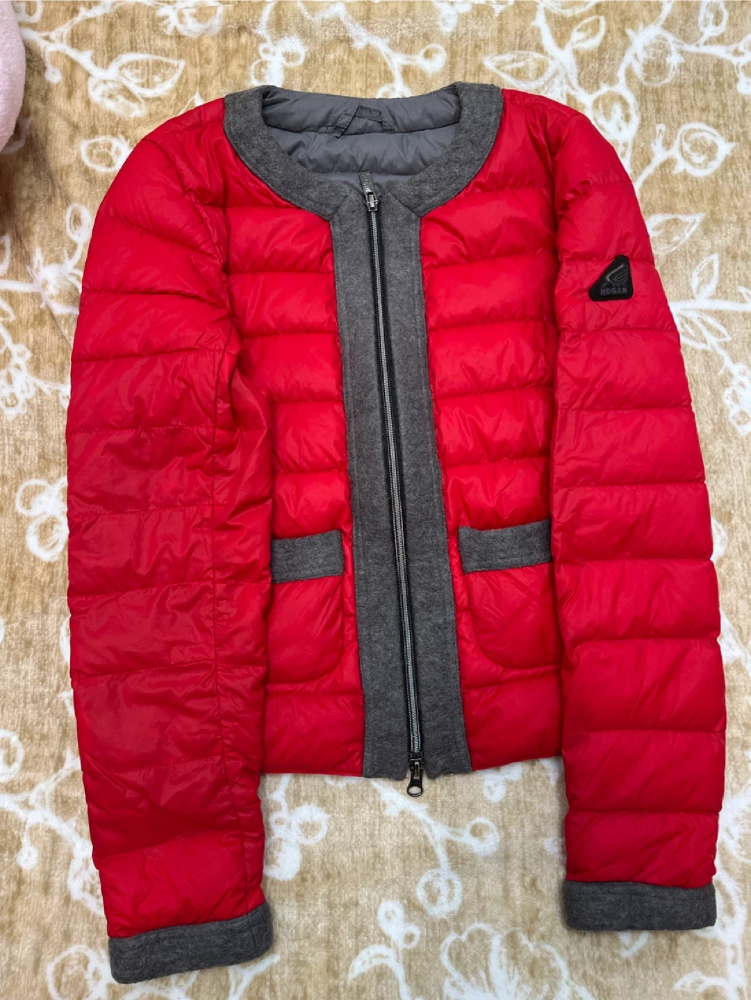 This is a stylish Hogan padded jacket in a vibrant red colour! It features a unique design with grey accents. It's perfect for adding a pop of colour to your wardrobe and staying warm at the same time.