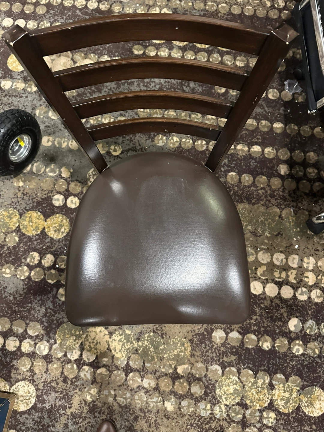 Here's a sturdy brown wooden dining chair! It has a ladder back design and a comfortable seat. Perfect for adding a touch of classic style to your dining area or kitchen.