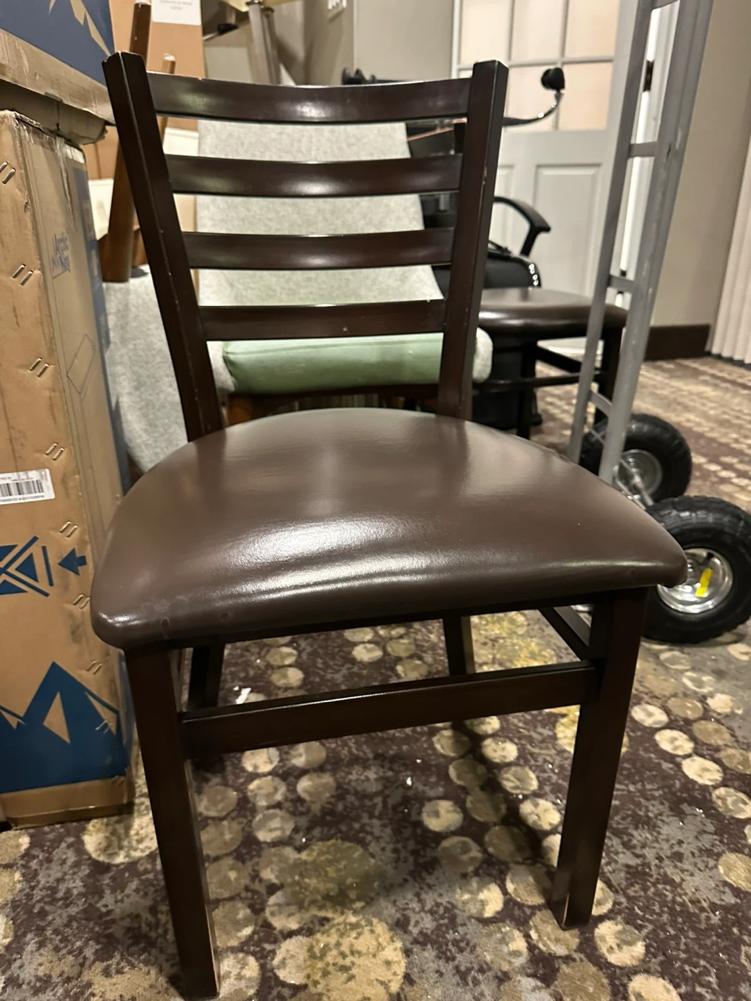 Here's a sturdy brown wooden dining chair! It has a ladder back design and a comfortable seat. Perfect for adding a touch of classic style to your dining area or kitchen.