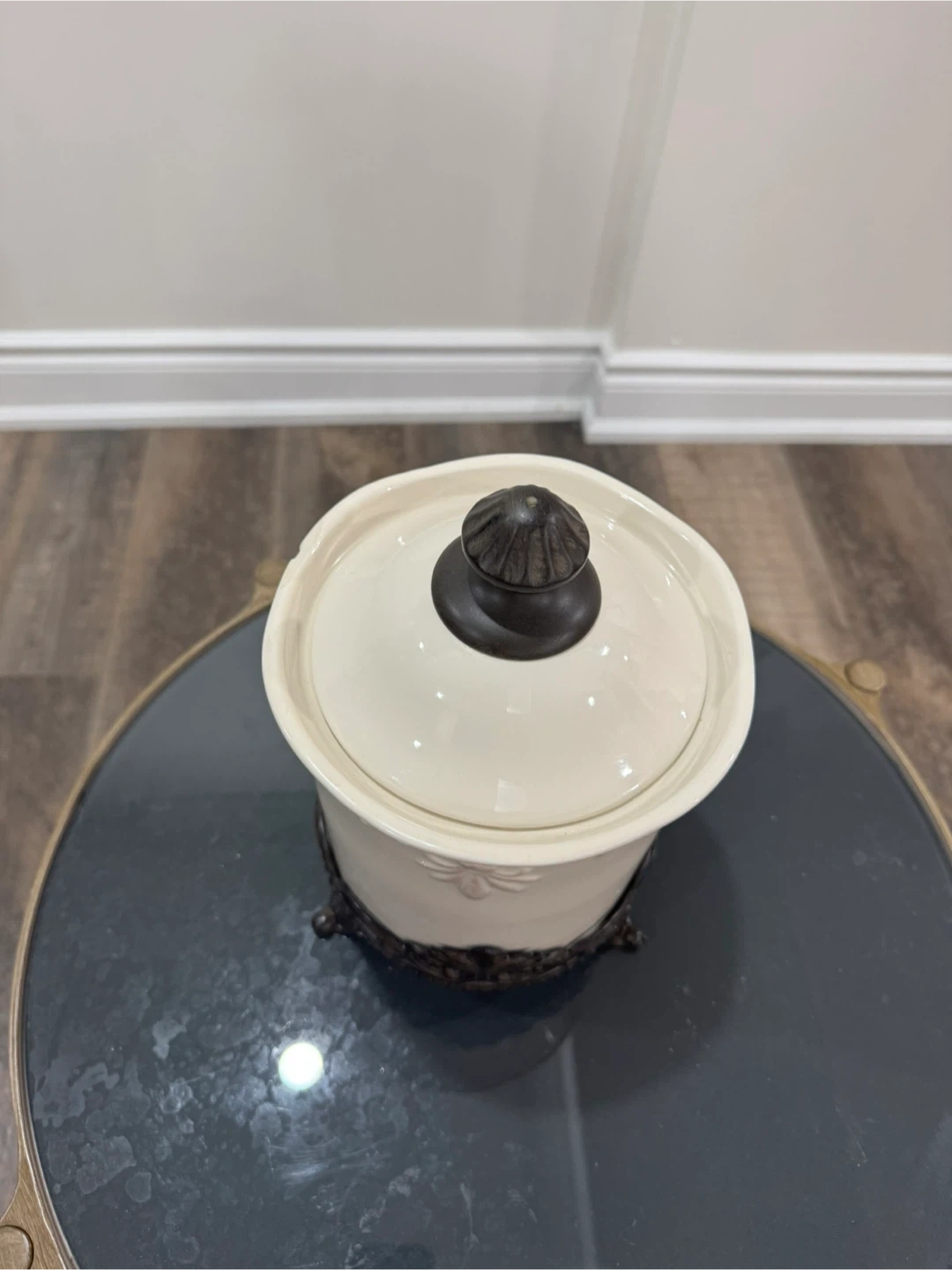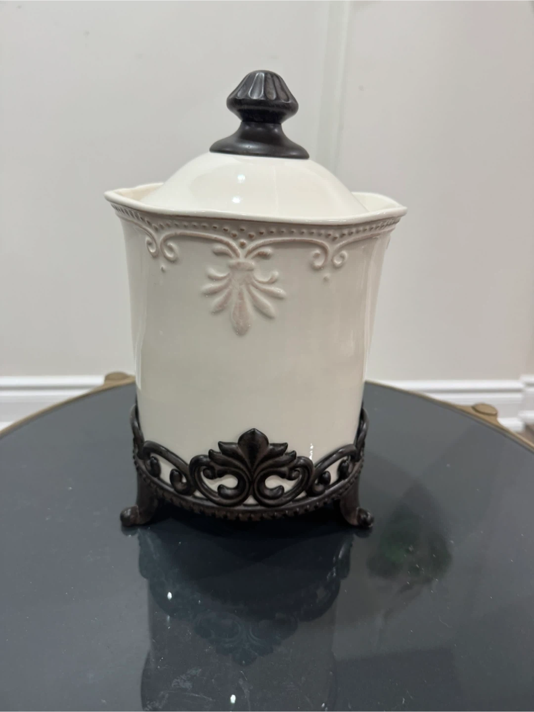 Selling a cream-coloured jar with a decorative metal stand. It's in great condition and would look lovely in any room