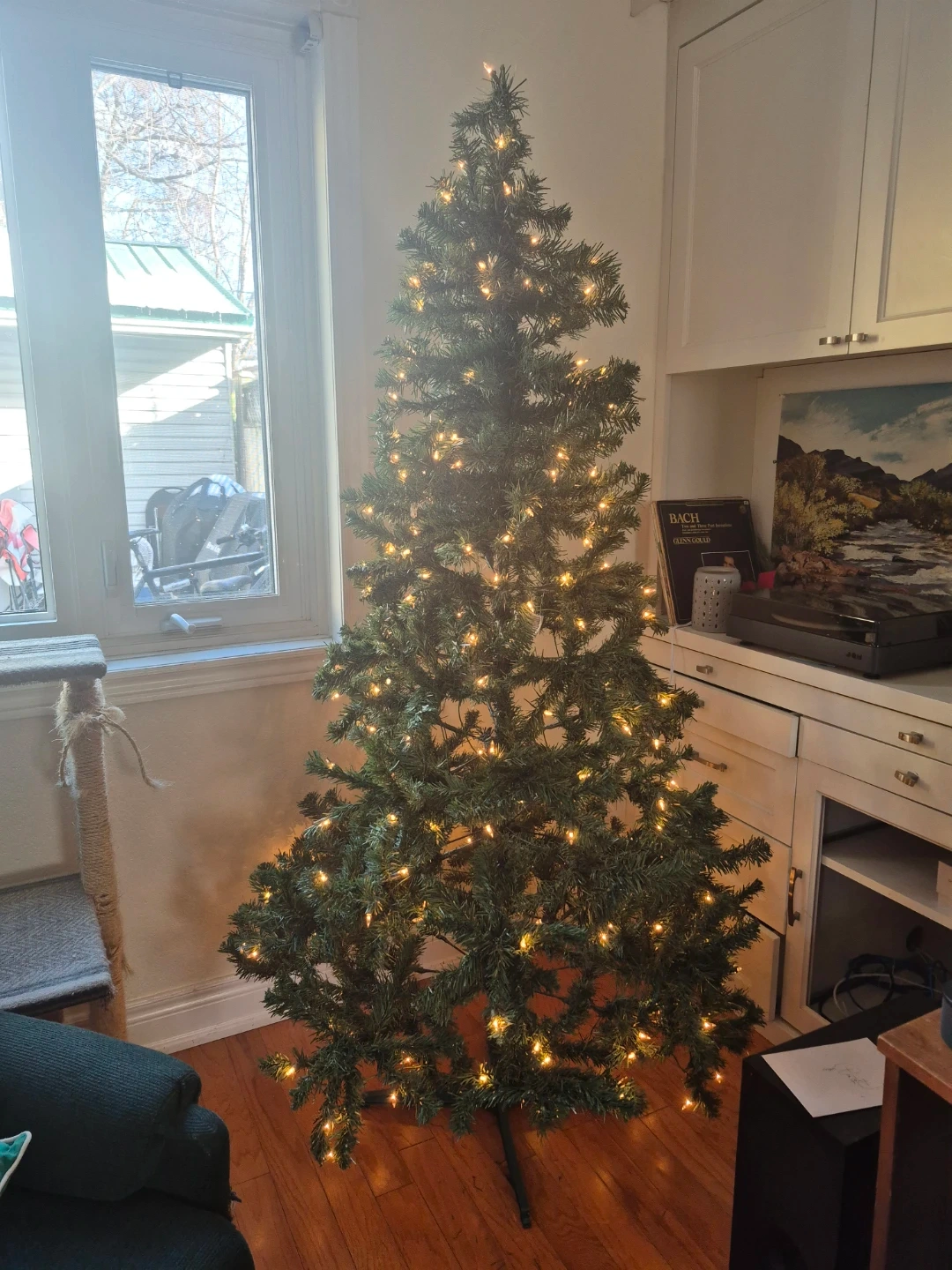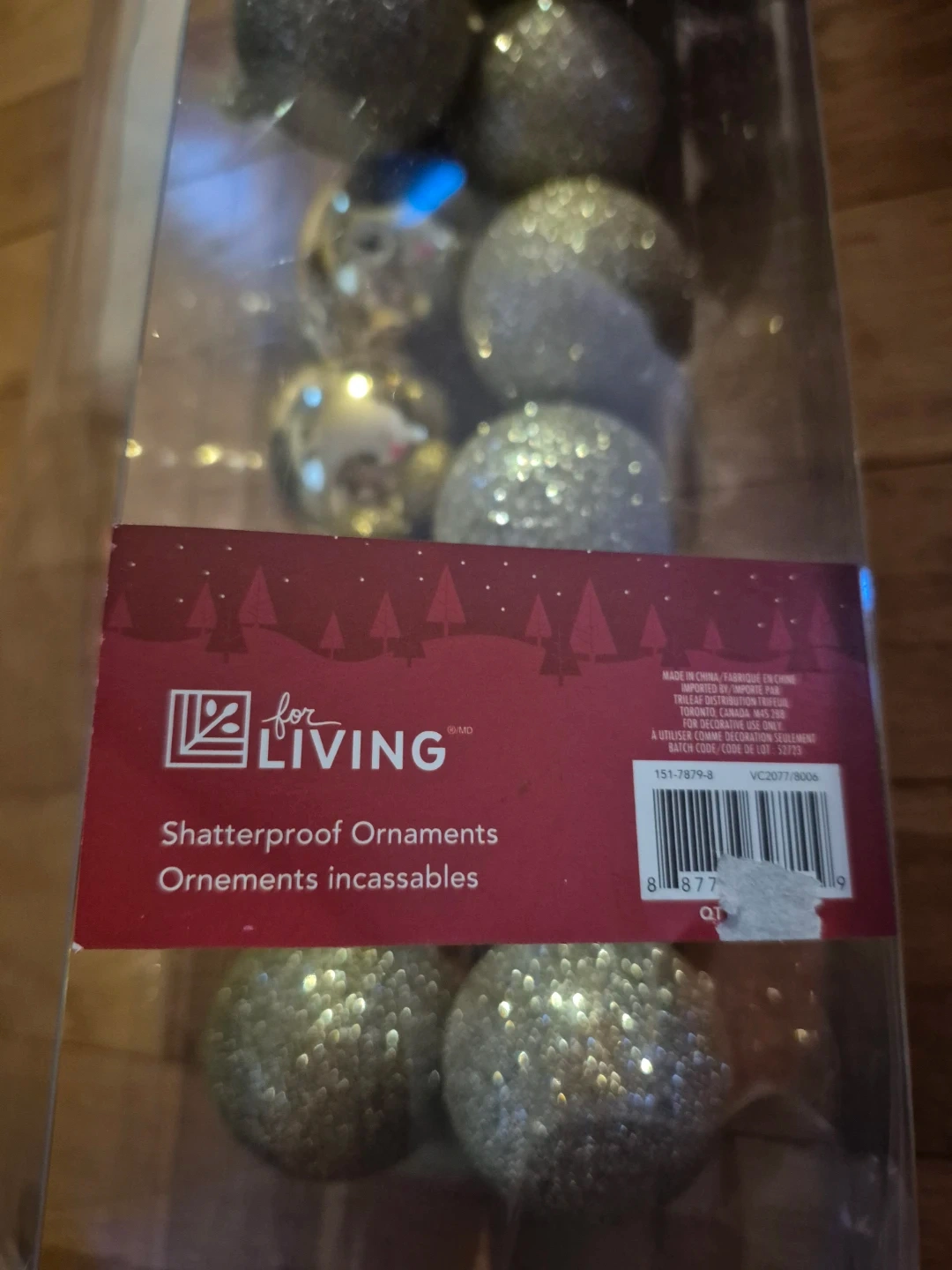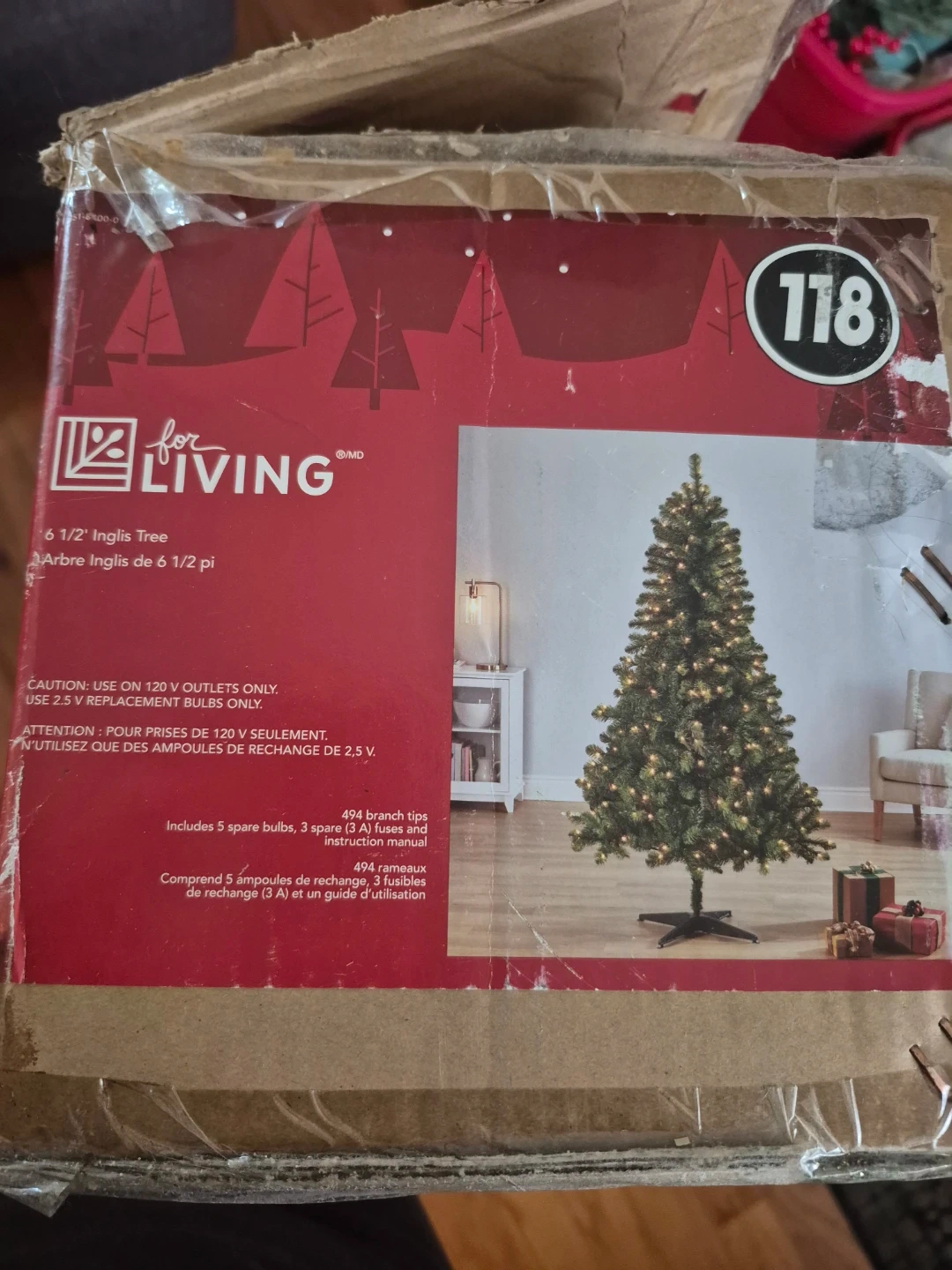 Selling a For Living 6 1/2' Inglis Tree with shatterproof ornaments. The tree includes lights and approximately 30 ornaments. Also included is a small wood sign (last photo).