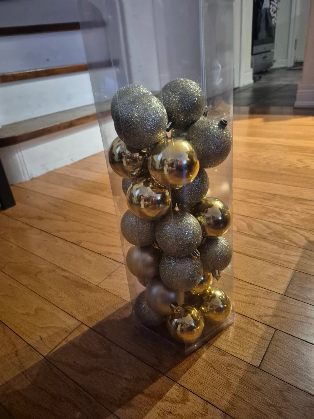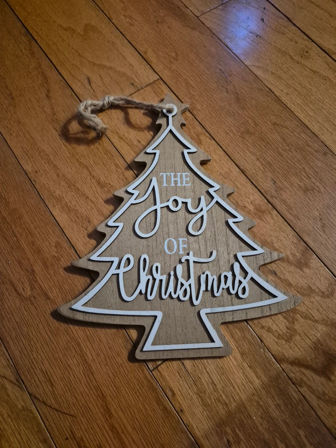 Selling a For Living 6 1/2' Inglis Tree with shatterproof ornaments. The tree includes lights and approximately 30 ornaments. Also included is a small wood sign (last photo).