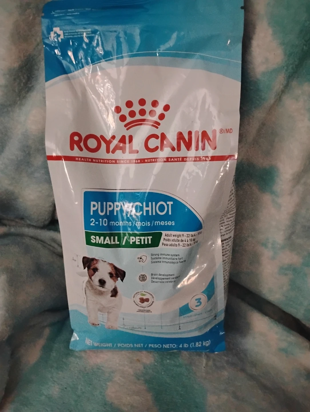 Selling a bag of Royal Canin Puppy food, designed for small breed puppies aged 2-10 months! It's a 4 lb bag, perfect for getting your little one started on a healthy diet. This food supports a strong immune system and brain development for a happy, healthy puppy