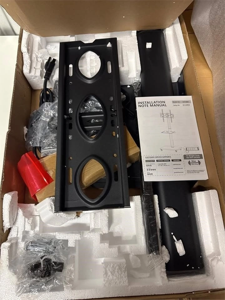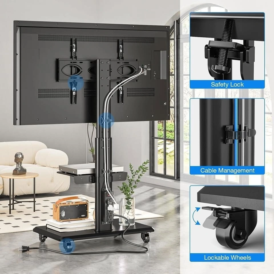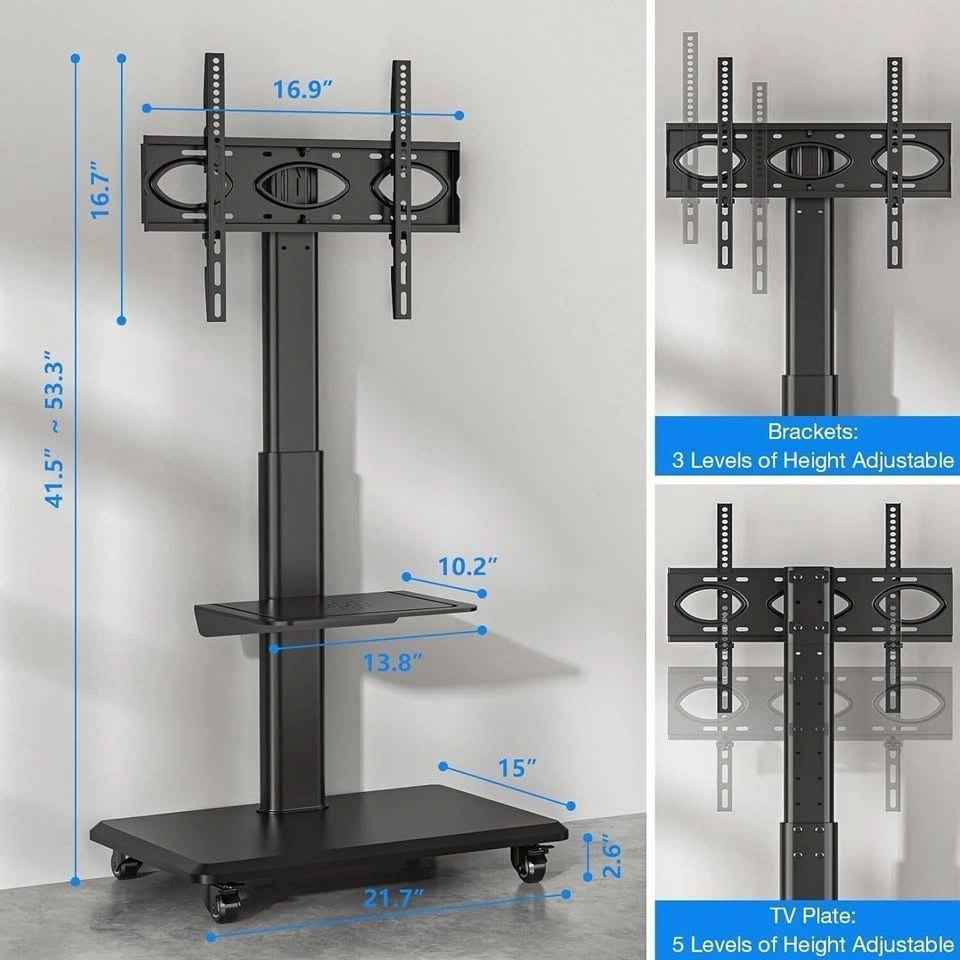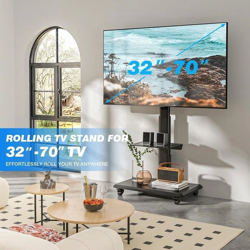 This TV stand has a beautiful design that will add color to your home and keep you in a happy mood. It's also equipped with a power strip (ETL certified) to say goodbye to messy wires. The power strip has a thicker 6.5 ft extension cord made of 16AWG pure copper and a one-button switch that turns it off when not in use, which can effectively prevent children from touching it and other problems, ensuring the safety of you and your family. This TV stand allows you to smoothly swivel your screen 30 left or right to direct the screen anywhere in the room. With 8 height settings, you can easily adjust your TV's height for the most comfortable eye level viewing height. Designed with a heavy duty reinforced alloy steel pole and wood-textured base. This TV stand can securely hold up to 88 lbs. Our TV stand is equipped with four silent wheels that can rotate 360 degrees. With these silent wheels, you can gently push this TV stand for home cleaning without worrying about disturbing your family. This TV stand can roll smoothly on wooden floors and carpets without damaging the floor. When the Rolling TV Stand is in the right position, lock the wheels. Easy to assemble universal rolling TV stand holds most TVs: Our mobile TV cart fits most 32 to 70 inch flat or curved screen LCD/LED/OLED TVs; Compatible VESA holes pattern 100 x 100 mm to 400 X 400 mm; With a substantial weight capacity of 88 lbs, it's the ideal choice for supporting for your favorite TV.