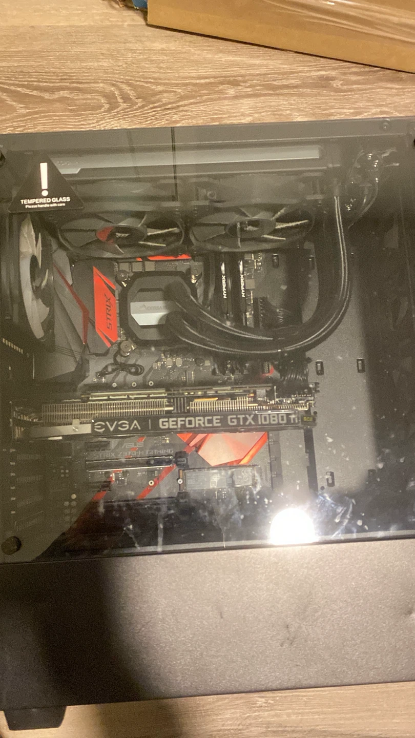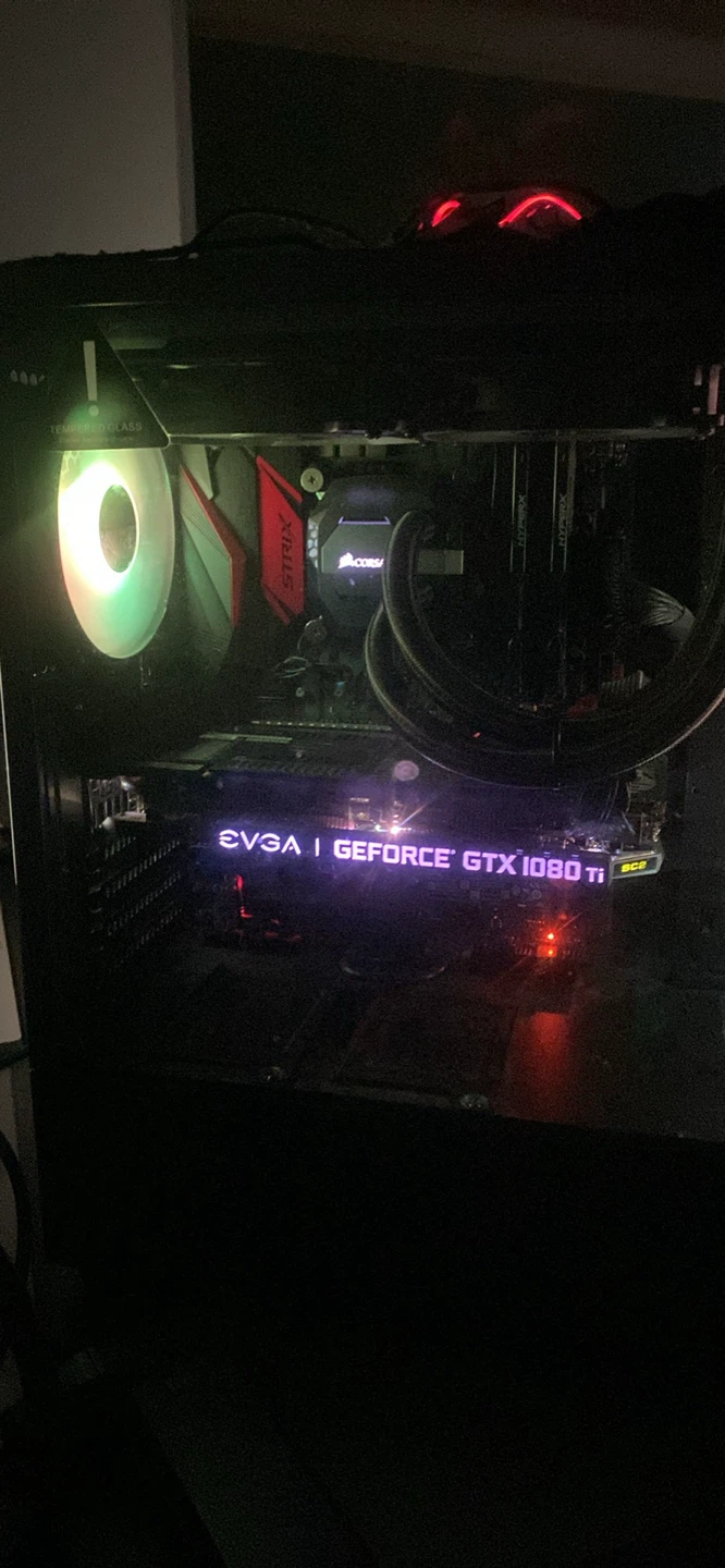 Selling a custom-built gaming PC. It features an EVGA GeForce GTX 1080 Ti graphics card and a Strix motherboard. Great for gaming or other demanding tasks! It has a tempered glass side panel.