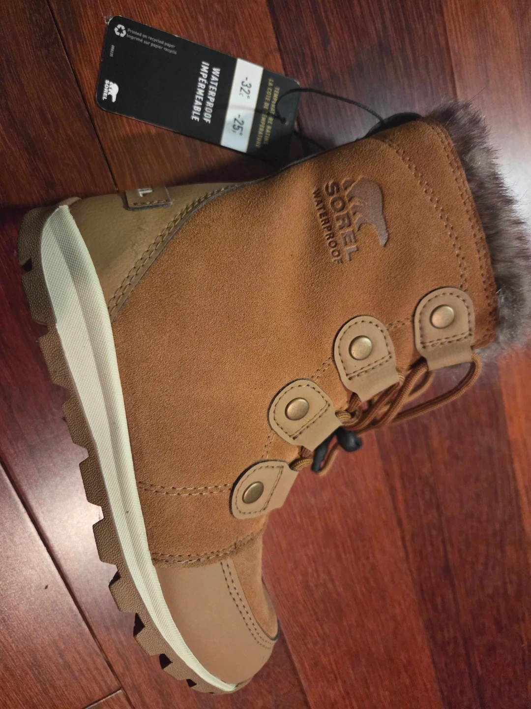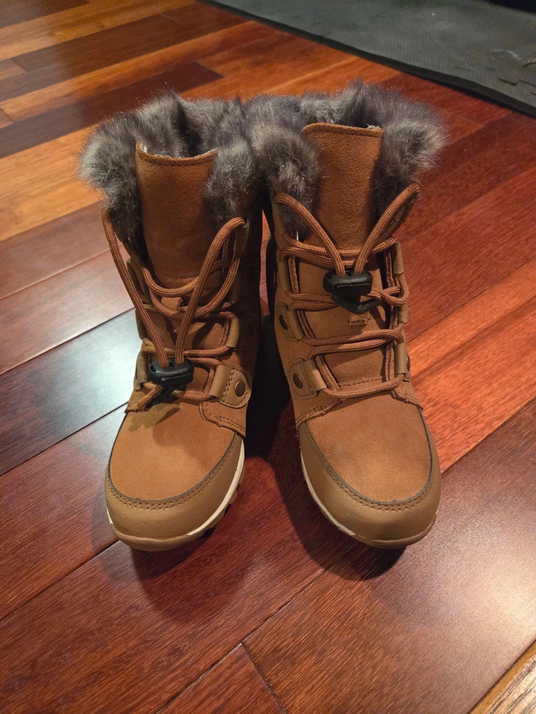 These are brand new Sorel Snow Commander boots for toddlers, size 1 US. They are waterproof and insulated to keep little feet warm and dry in cold weather. The boots feature a faux fur trim and easy lace-up closure. Perfect for winter adventures!