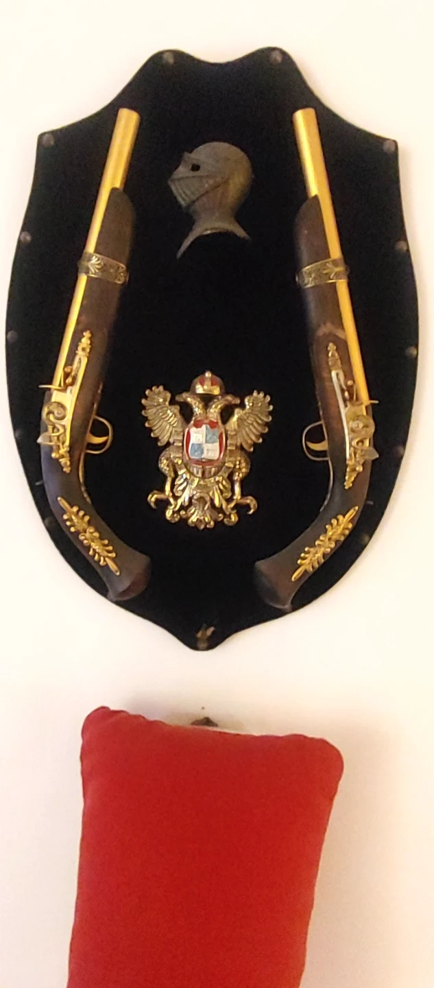 Selling a decorative antique gun set mounted on a black shield. The set features two ornate guns with gold accents and a central emblem. Great for adding a unique touch to your decor!