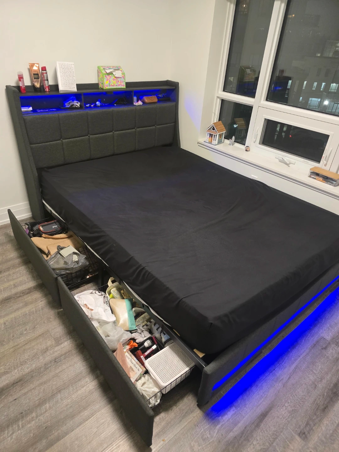 • 4 large storage drawers & shelves for clothes, bedding, accessories