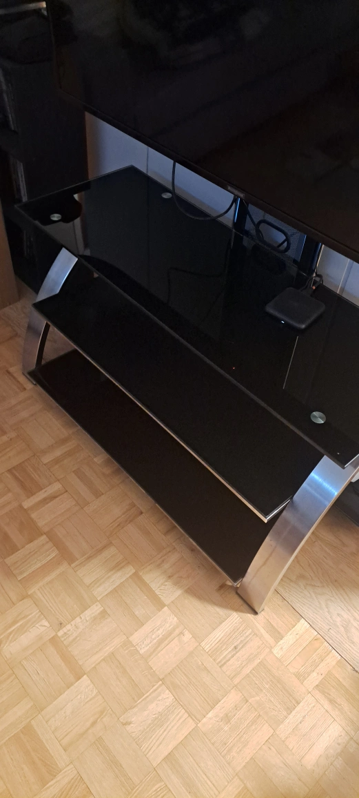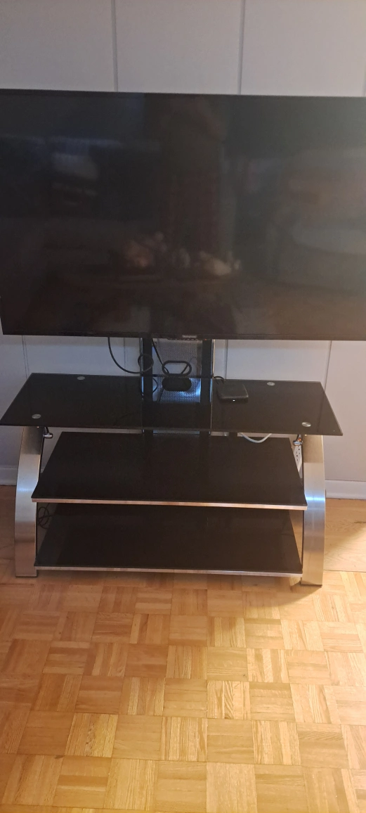 Selling a stylish TV stand with a black glass top and chrome frame. It features multiple shelves for storage and a built-in TV mount. Perfect for any living room setup!