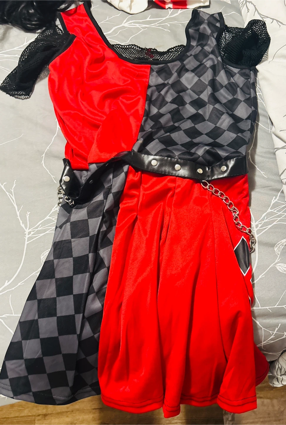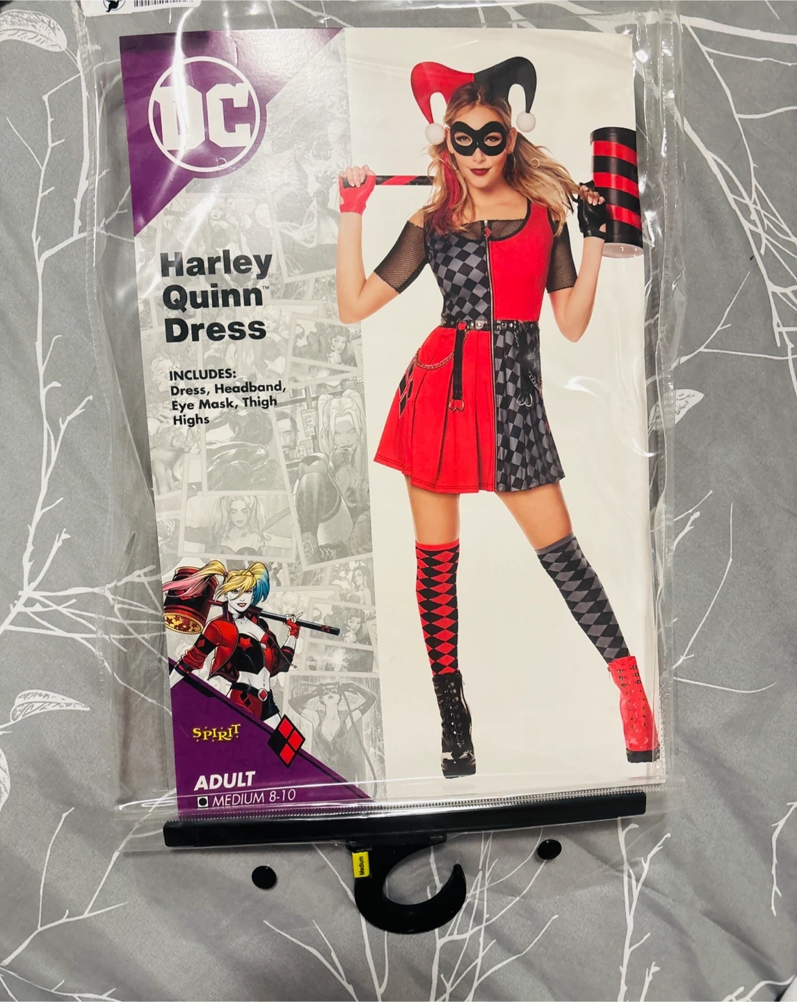 I'm selling a brand new Harley Quinn Dress in adult size medium. It comes with the dress, headband, eye mask, and thigh highs! The original price was $64.99. Perfect for Halloween or cosplay!
