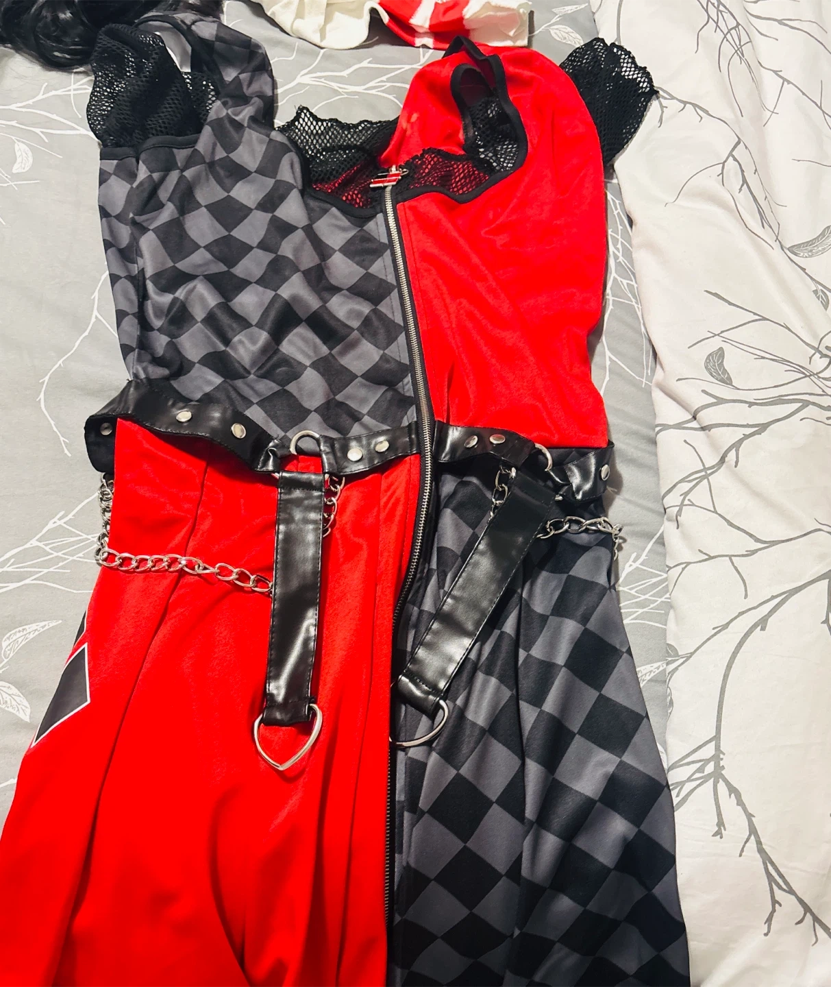 I'm selling a brand new Harley Quinn Dress in adult size medium. It comes with the dress, headband, eye mask, and thigh highs! The original price was $64.99. Perfect for Halloween or cosplay!