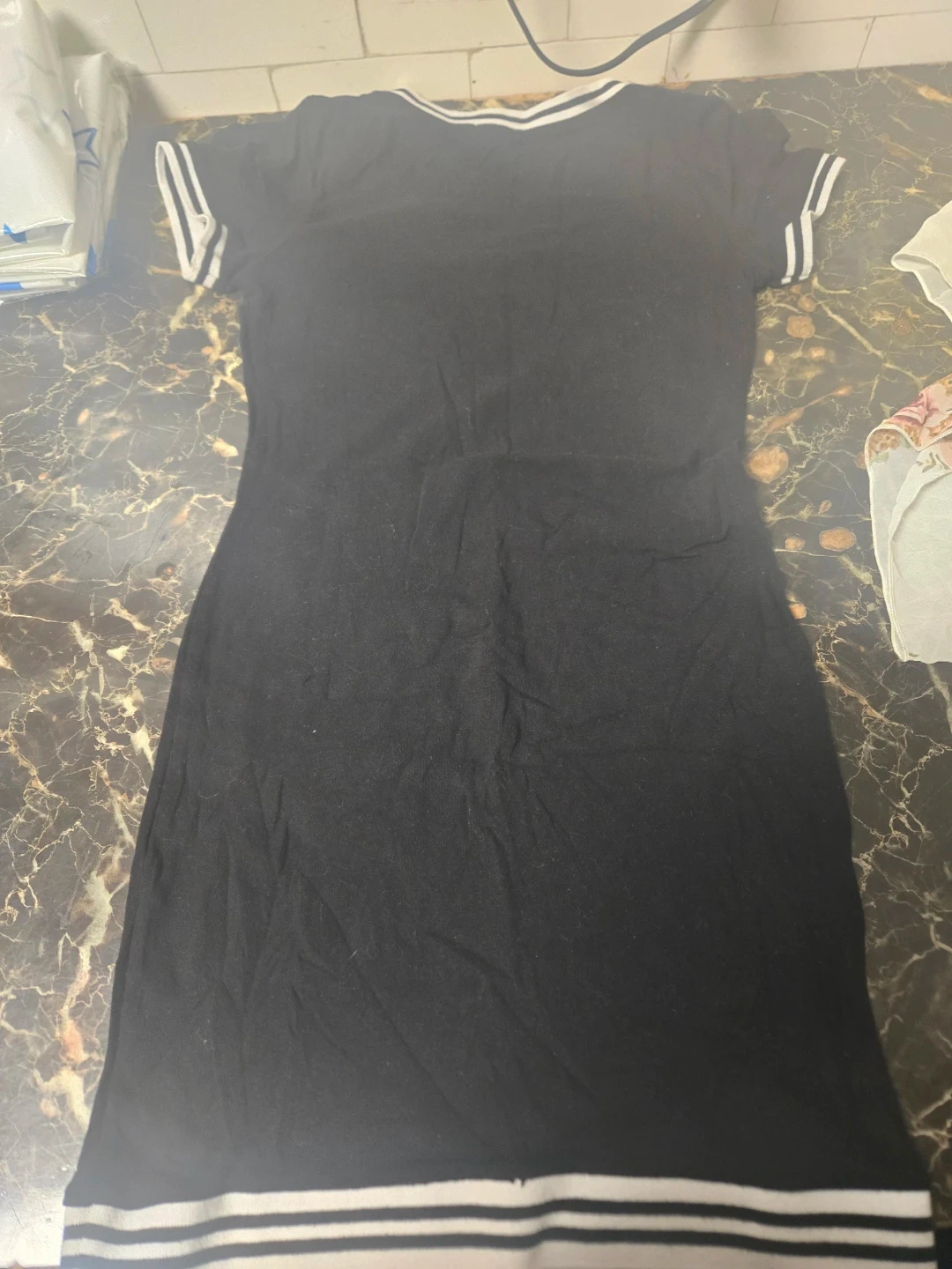 Cute black mini dress with white trim on the neckline, sleeves, and hem. It's in great condition and perfect for a casual outing or a night out
