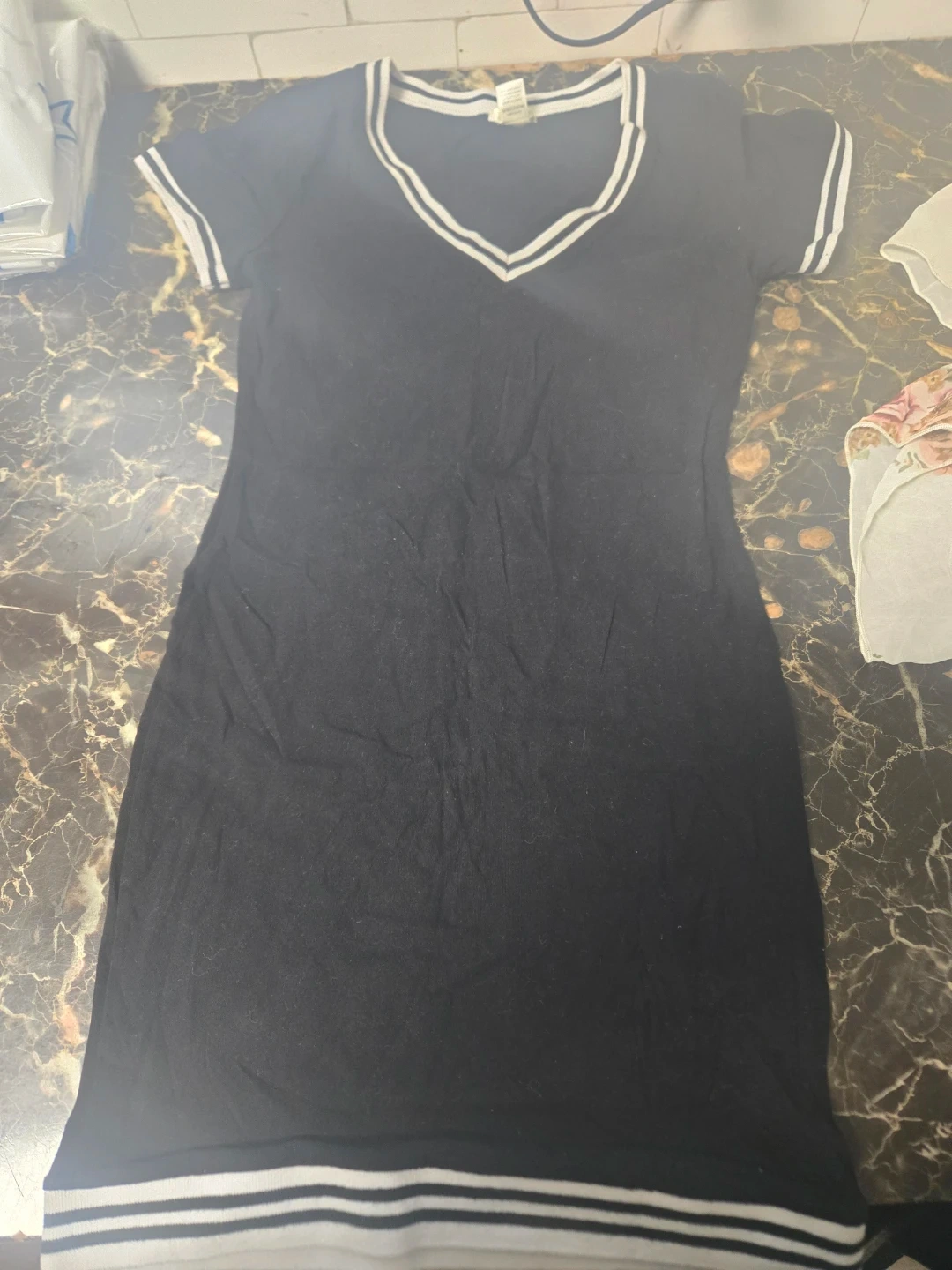 Cute black mini dress with white trim on the neckline, sleeves, and hem. It's in great condition and perfect for a casual outing or a night out