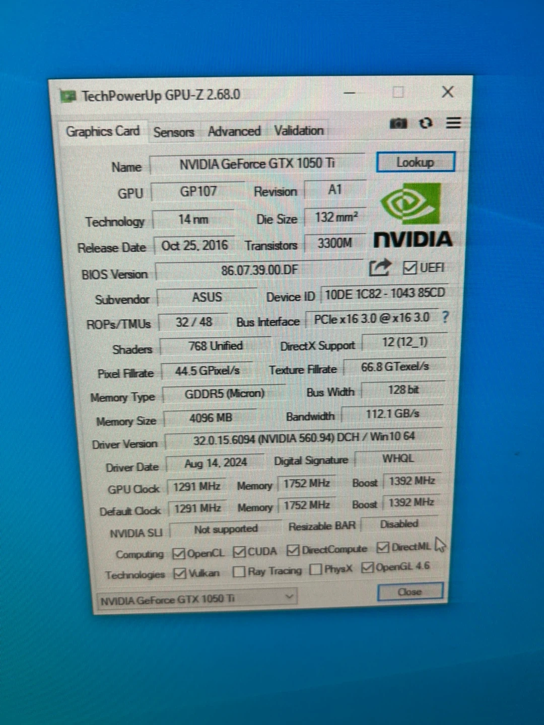 Asus ROG GTX 1050Ti 4GB video card (GPU-Z shown for reference from same machine running Windows)