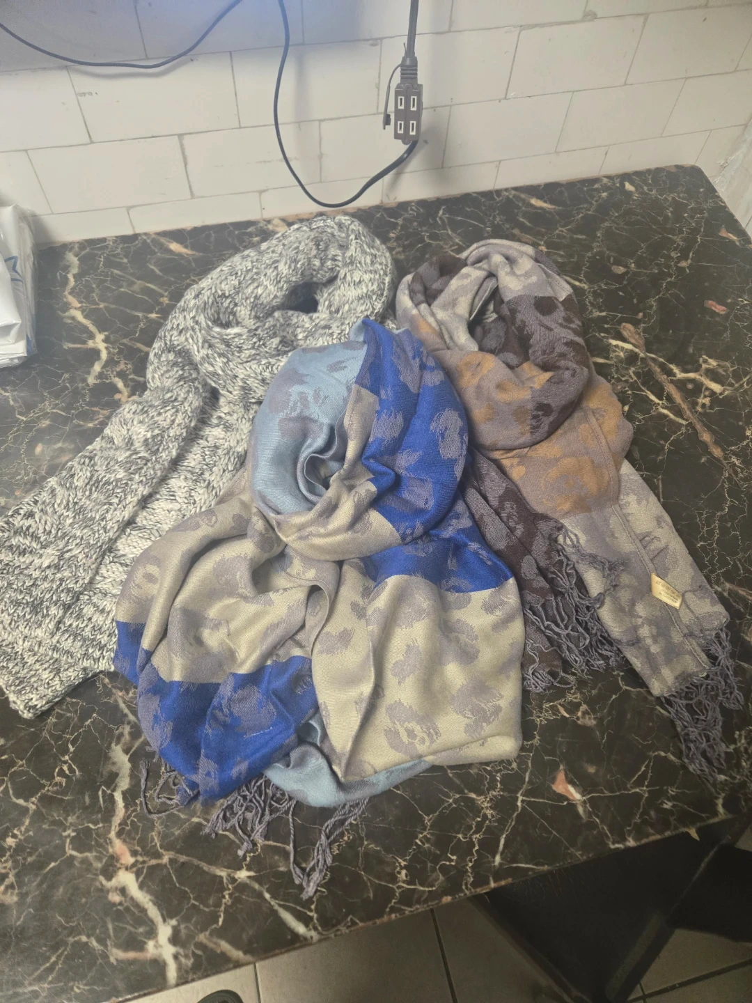 Selling a set of assorted scarves in various colors and materials. There's a grey knitted scarf, a blue and grey patterned scarf, and a brown patterned scarf. They're all in good condition and ready to keep you warm!