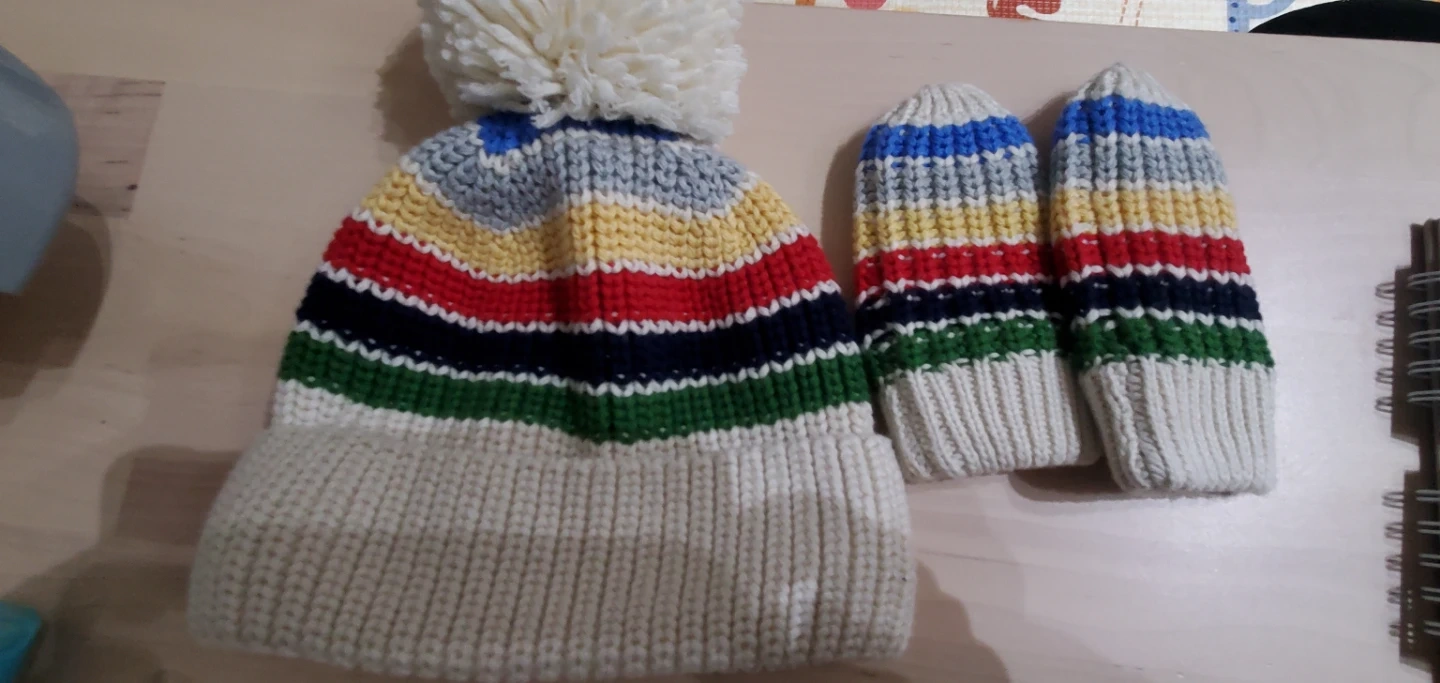 Here's a cozy knit hat and mitten set! The hat has a cute pompom on top and colourful stripes. The mittens match the hat, perfect for keeping warm this winter!