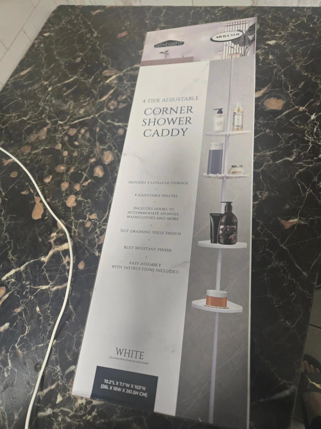 Here's a 4-tier adjustable corner shower caddy by All Bath! It's white and provides 4 levels of storage with 4 adjustable shelves. It includes hooks to accommodate sponges and washcloths, and has a self-draining shelf design with a rust-resistant finish. Easy assembly with instructions included! Dimensions are 10.2"L x 7.1"W x 103"H