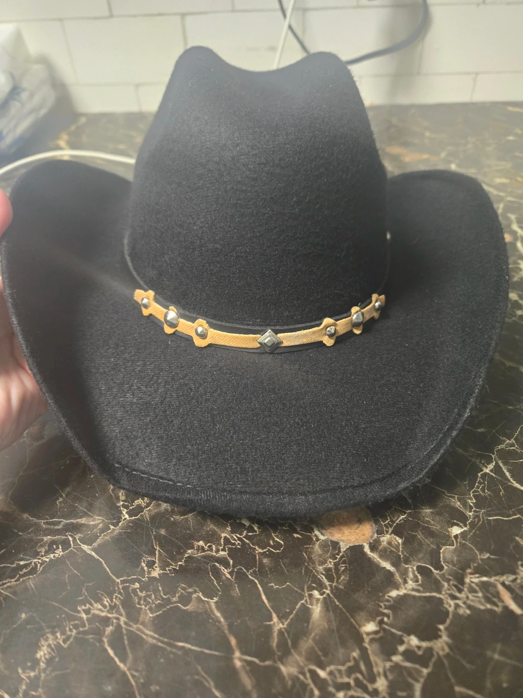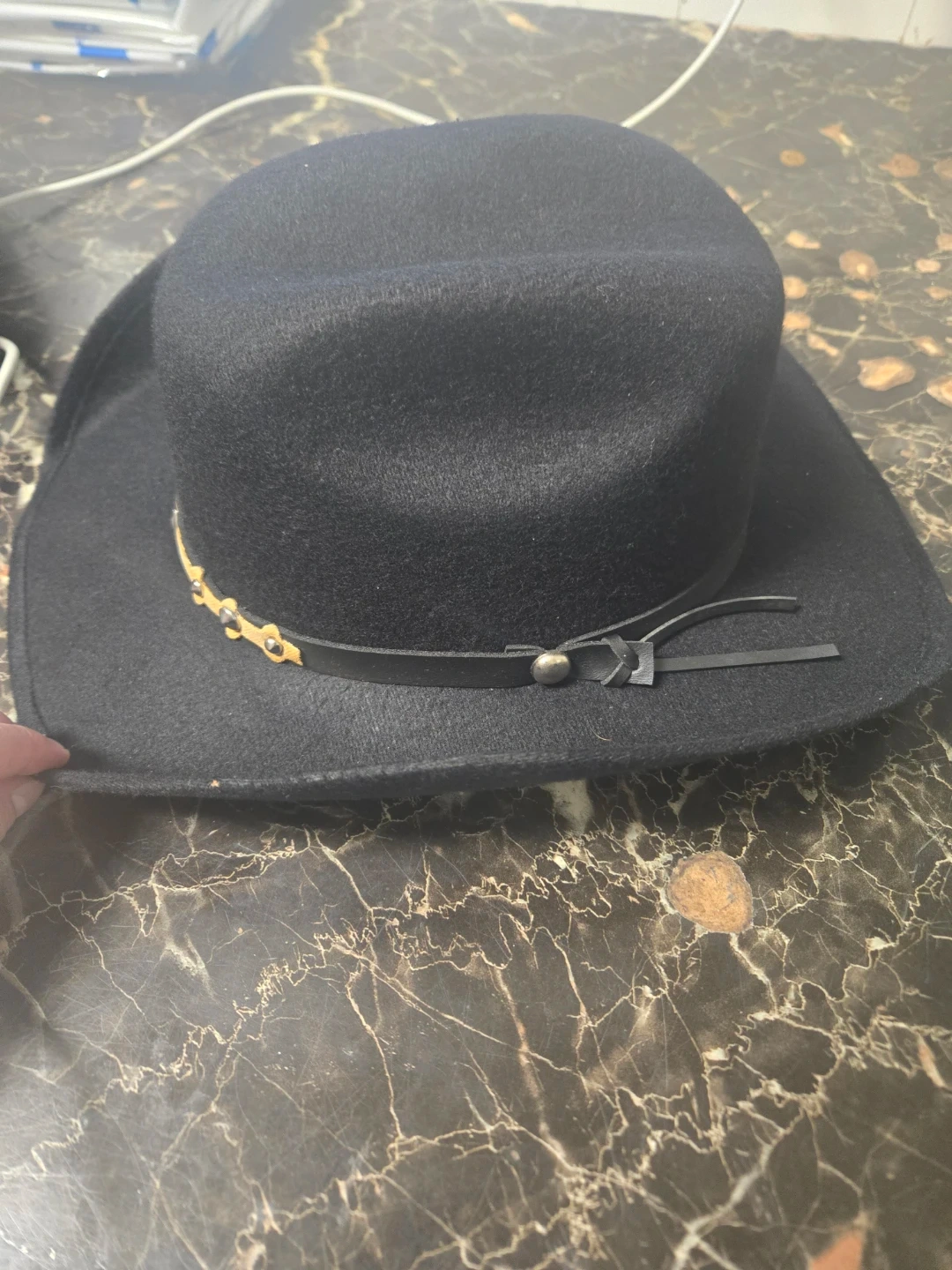 Selling a black Resistol cowboy hat. This stylish hat is perfect for adding a touch of western flair to any outfit. It's in great condition and ready for a new owner!
