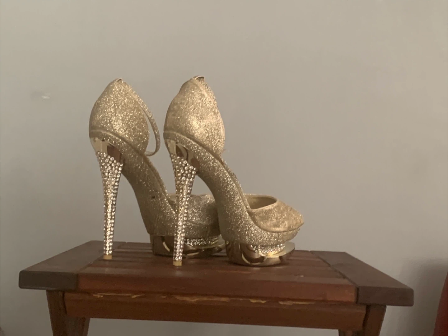 Selling a pair of gold glitter heels. They have a peep toe and ankle strap. The heels are stiletto style and decorated with rhinestones.