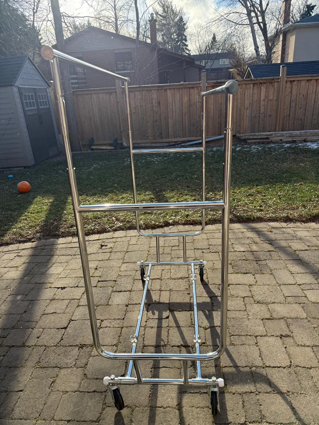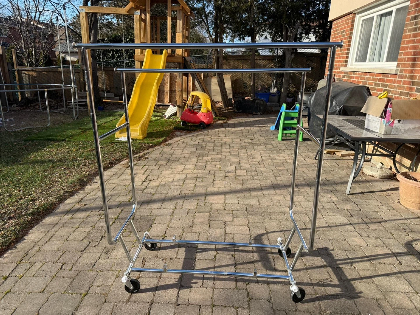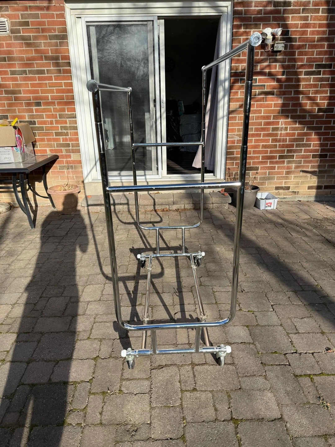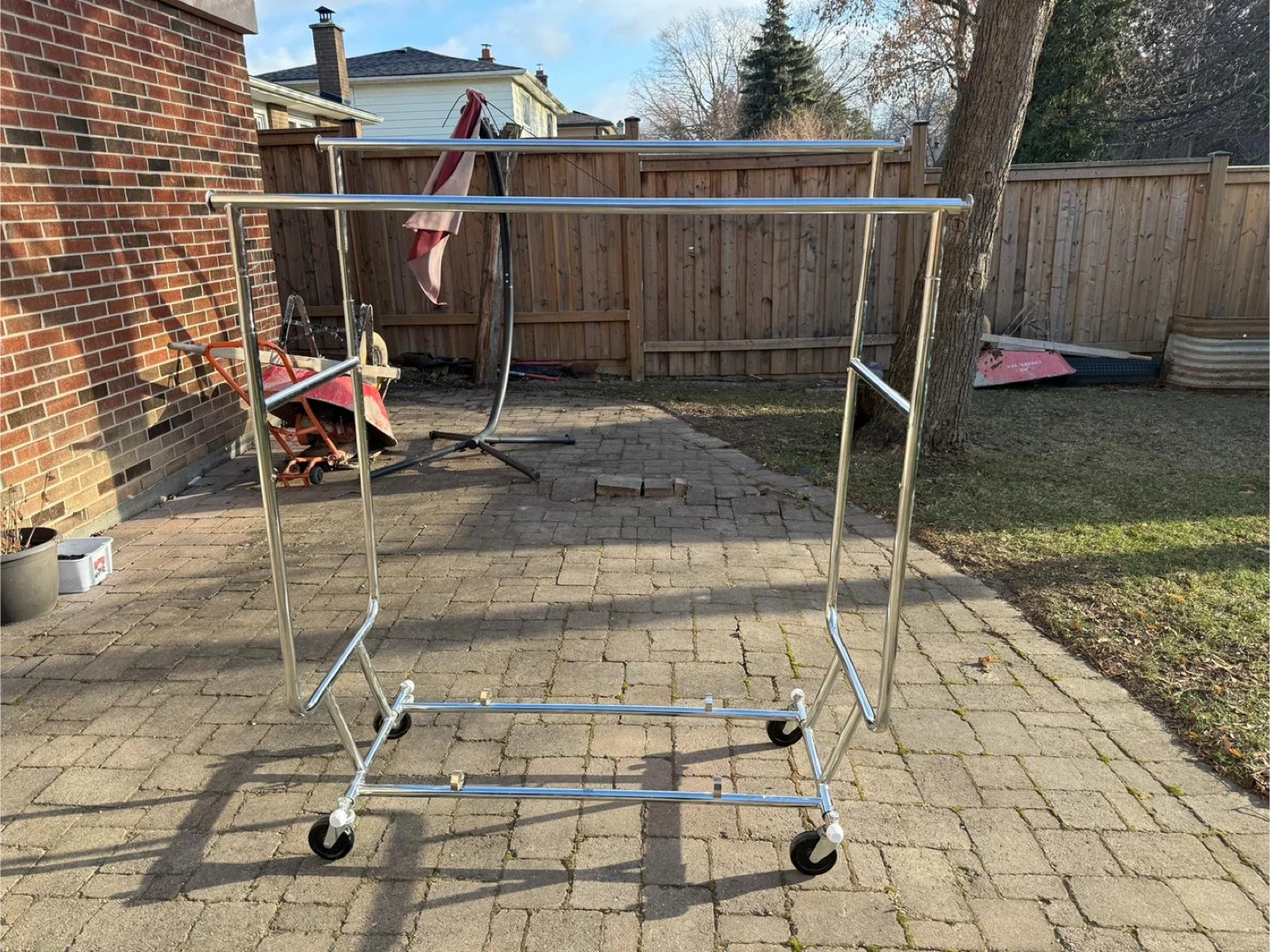 Here's a sturdy rolling garment rack with a double rail! It's great for extra storage or for organizing clothes. It's in good condition and ready to use.