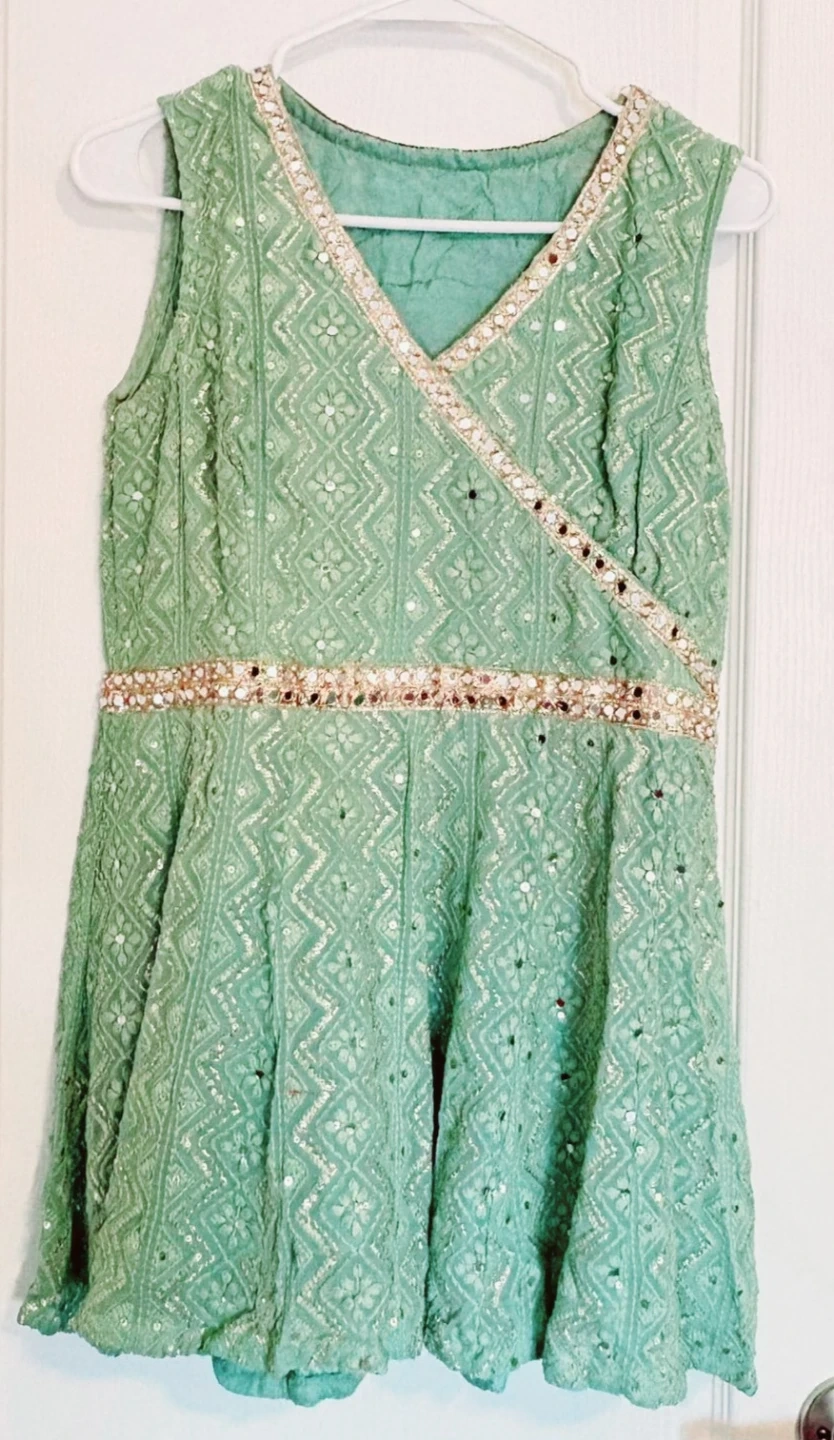 Selling beautiful 3 piece Mint Green Garara set with A lined sleeveless short shirt, garara and plain dupatta.