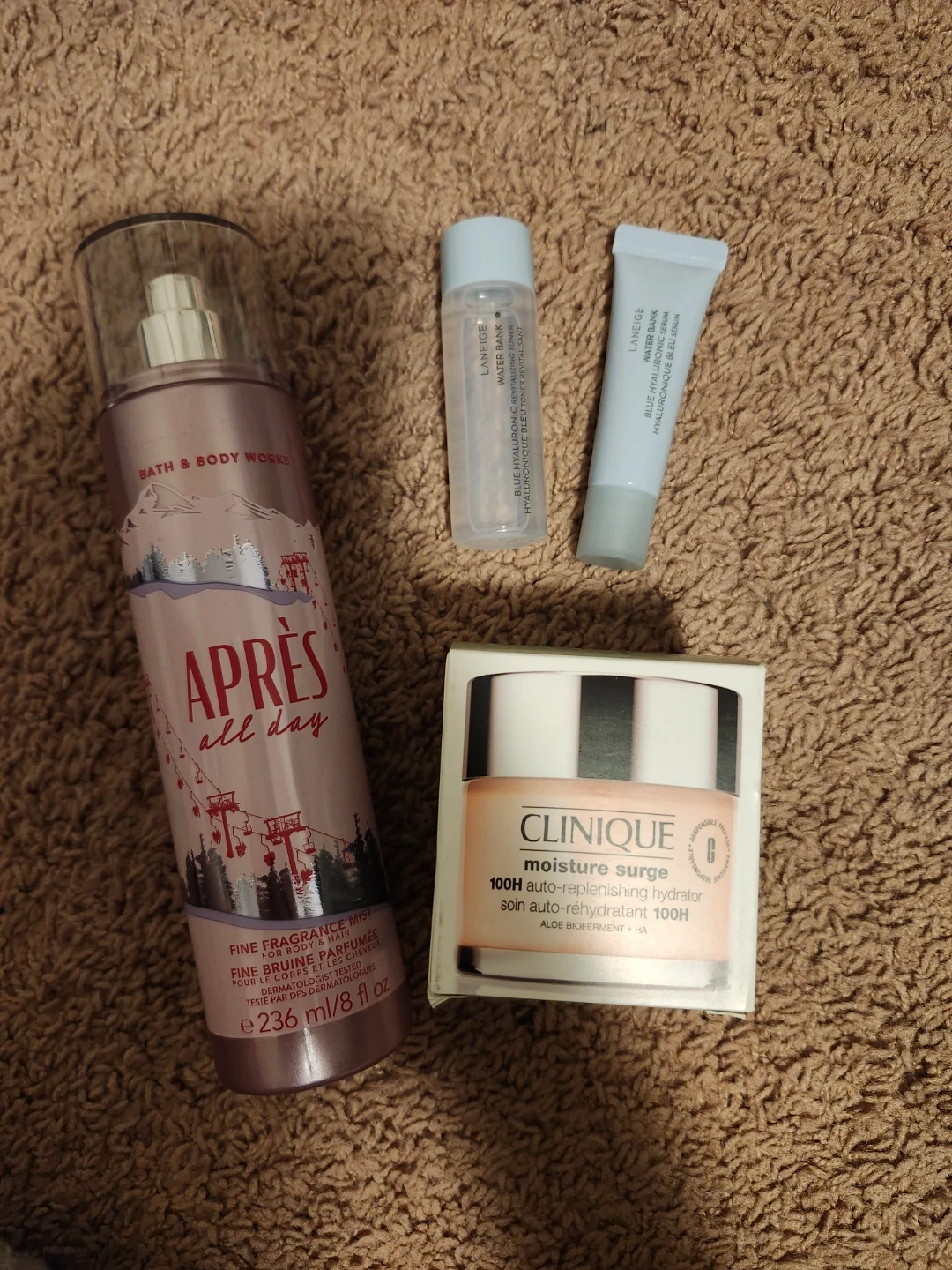 Selling a Bath & Body Works Après All Day fine fragrance mist! It's for body and hair, and the bottle contains 236 ml / 8 fl oz. Also included are Clinique Moisture Surge 100H auto-replenishing hydrator and Laneige Water Bank Blue Hyaluronic serum and revitalizing toner