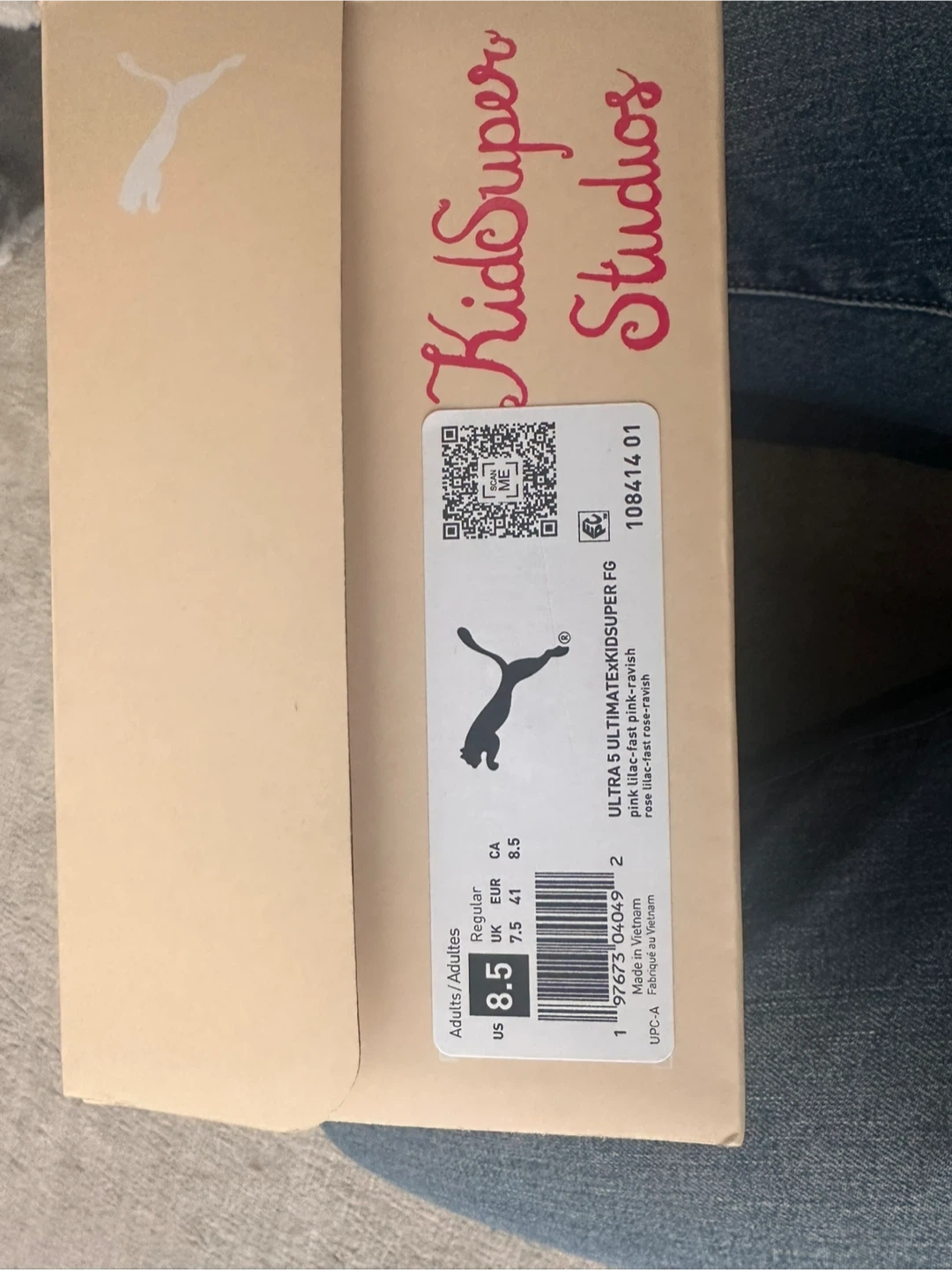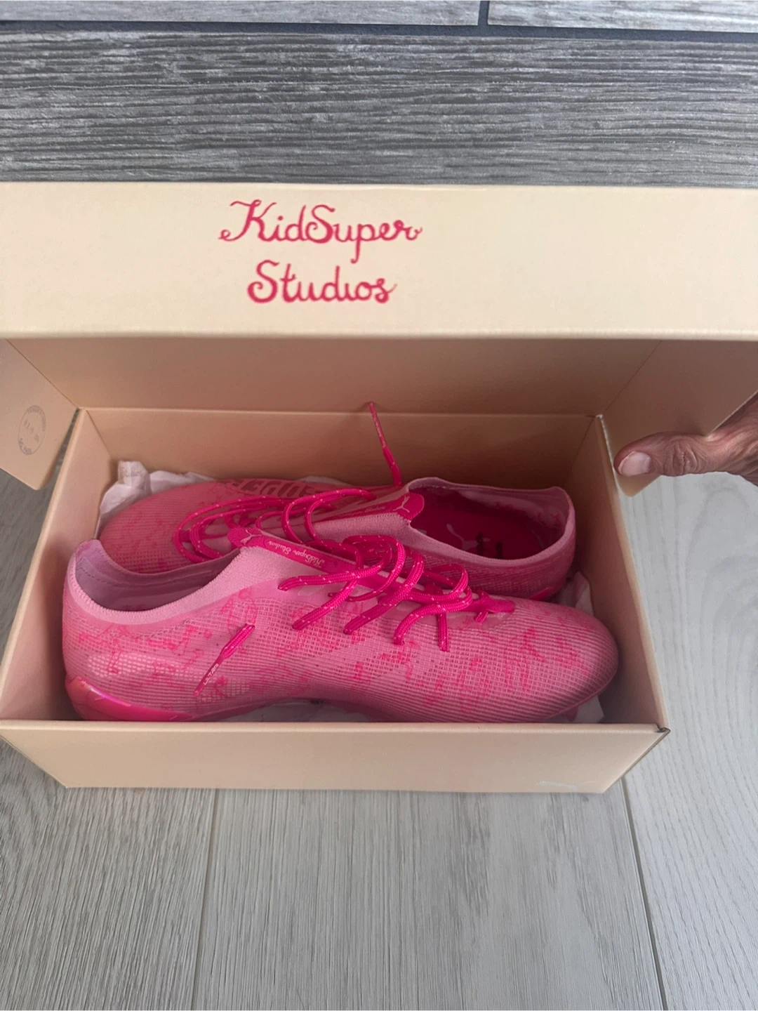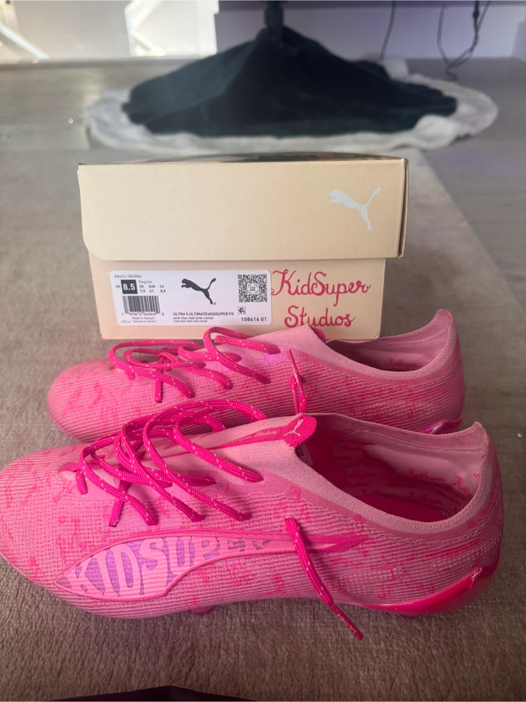 Puma Ultra 5.1 x KidSuper FG soccer cleats in US adult size 8.5! These are a vibrant pink colour and come with the original box and bag. Currently sold out . A stylish choice for your next game! Was ordered from soccer world as a gift and too tight cannot return. Ready for someone else to enjoy.