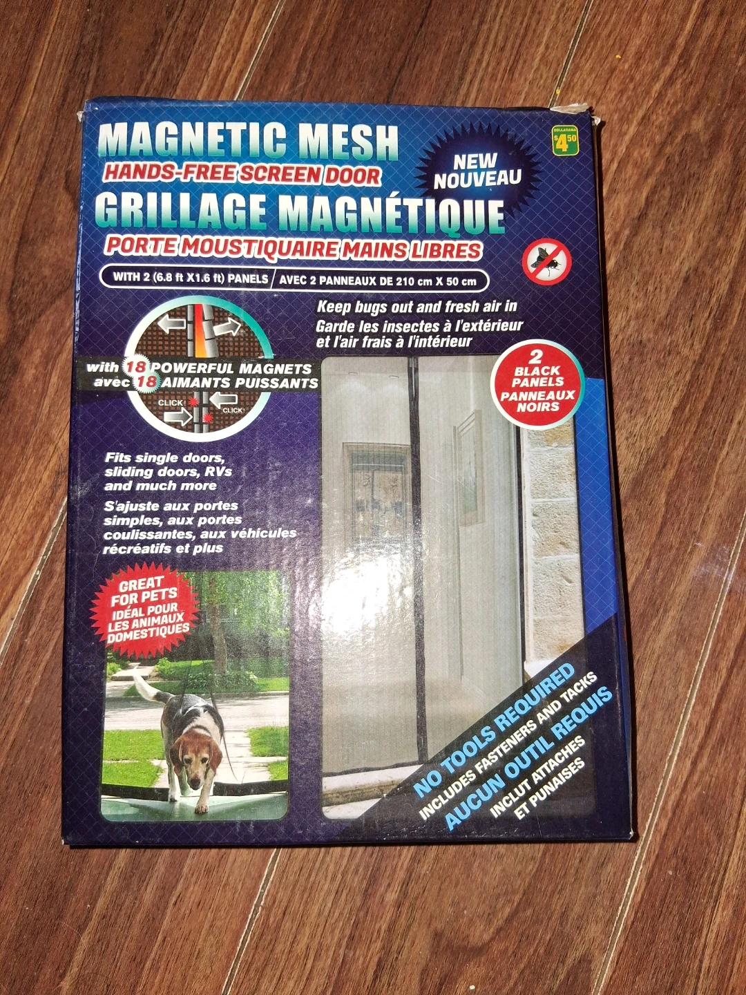 This magnetic mesh screen door keeps bugs out and lets fresh air in. It's designed for hands-free use and fits single doors, sliding doors, RVs, and more. Installation requires no tools and includes fasteners and tacks. It's great for pets too!