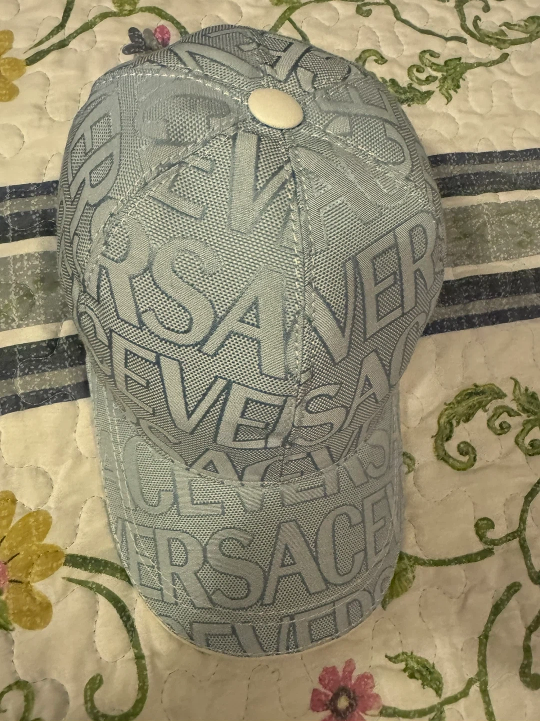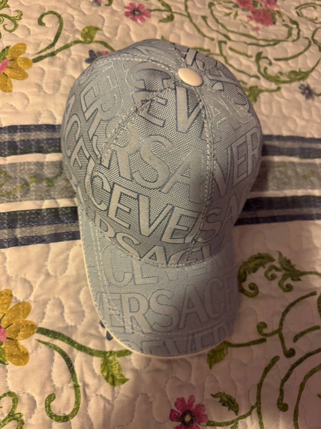 Selling a light blue Versace baseball cap. It features the Versace logo pattern throughout. Great for adding a touch of luxury to your everyday look!