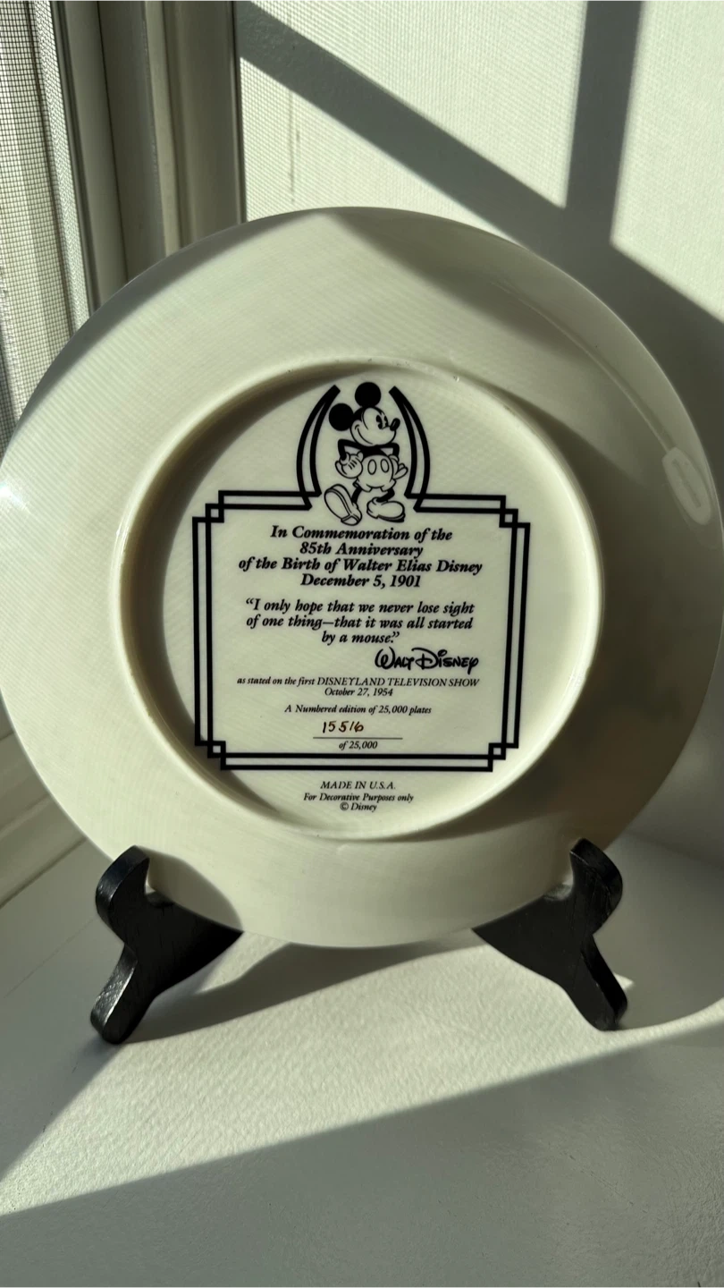 Selling a Walt Disney commemorative plate celebrating the 85th Anniversary of his birth. It's a numbered edition of 25,000 plates made in the USA. The plate features Walt Disney surrounded by classic Disney characters