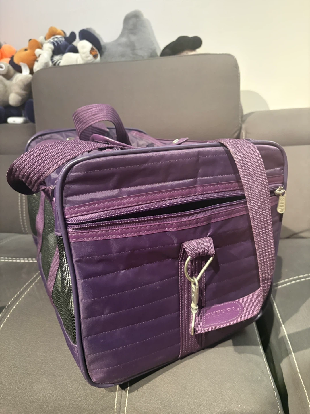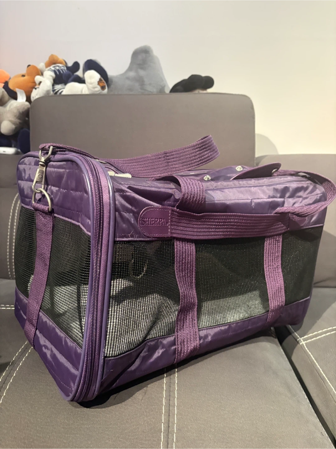Selling a Sherpa pet carrier in purple! With both shoulder and hand carry straps. It's in great condition and perfect for taking your furry friend on trips. It features mesh windows for ventilation and a comfortable interior for your pet. The terry insert is washable.