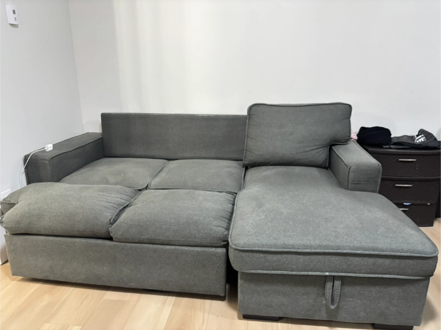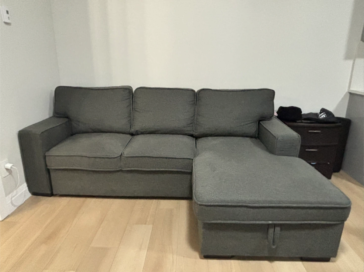 Selling a comfy grey sofa with a chaise lounge! It's in great shape and ready for a new living room. Perfect for lounging and relaxing after a long day